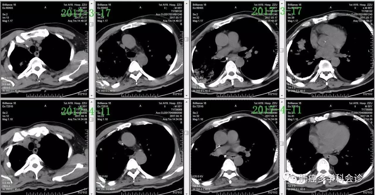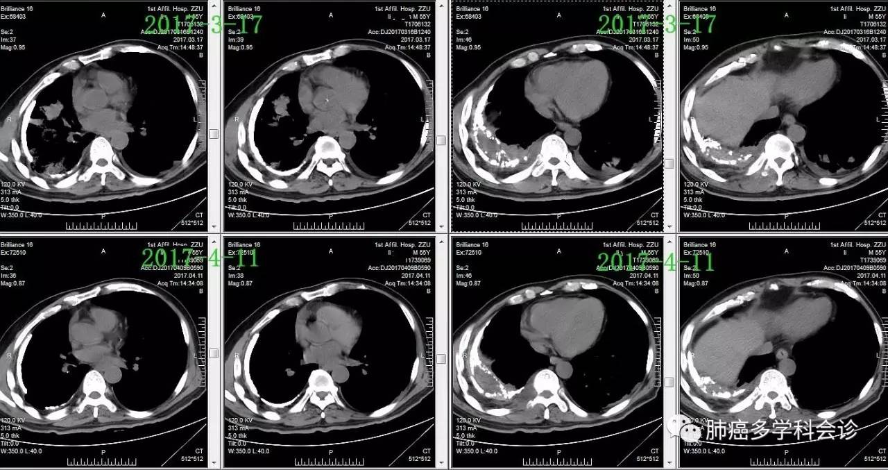 以下化疗前1周(2017-3-17)和第一周期化疗结束后(2017-4-11)两肺转移灶和右胸膜腔病灶的变化: