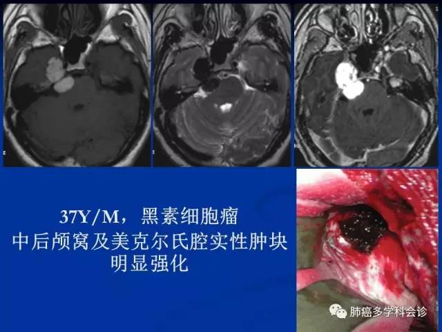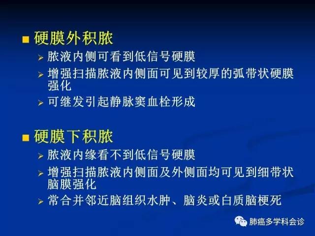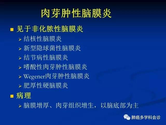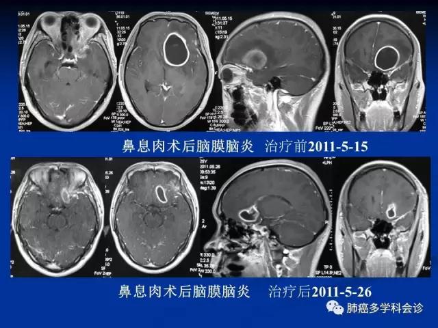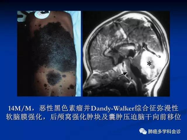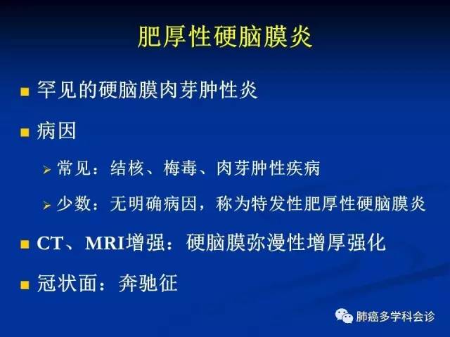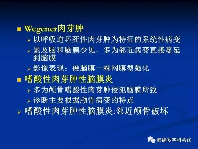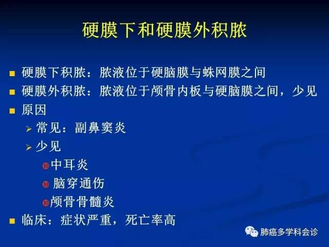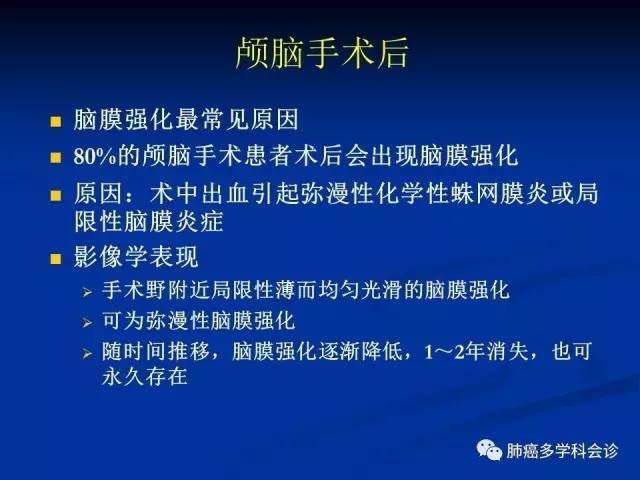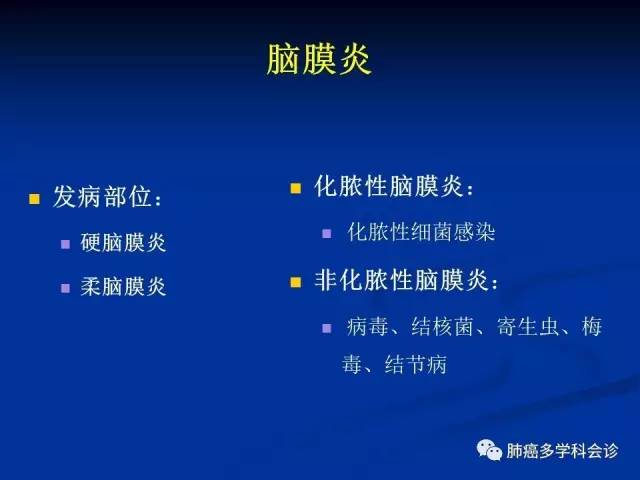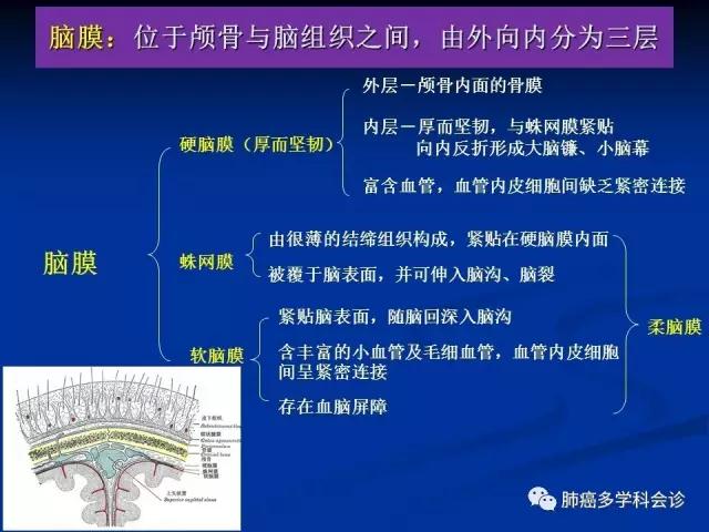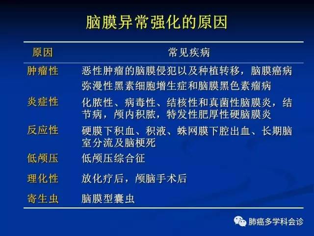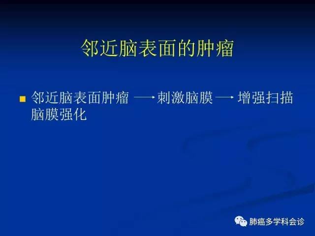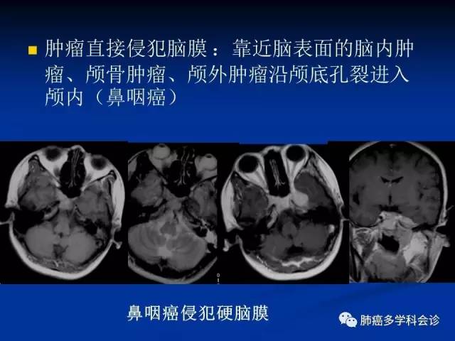 肿瘤直接侵犯脑膜 :靠近脑表面的脑内肿瘤、颅骨肿瘤、颅外肿瘤沿颅底孔裂进入颅内(鼻咽癌)
