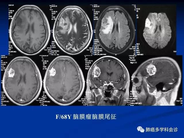 增强:线条样强化,超出肿瘤与硬膜相连的范围,向周围延伸,称为脑膜尾征