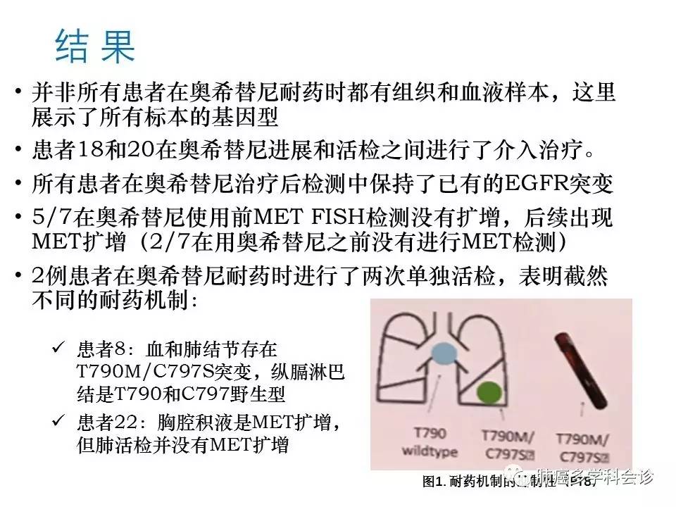 • 在奥希替尼耐药的23人队列中,进行组织和血液活检,MET扩增是最常见的耐药机制,见于30%的患者,EGFR T790M/C797S  见于22%的患者。