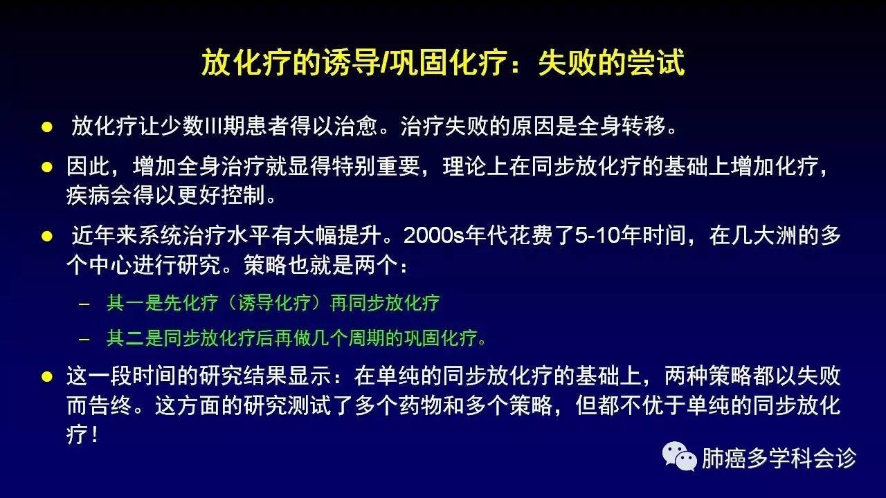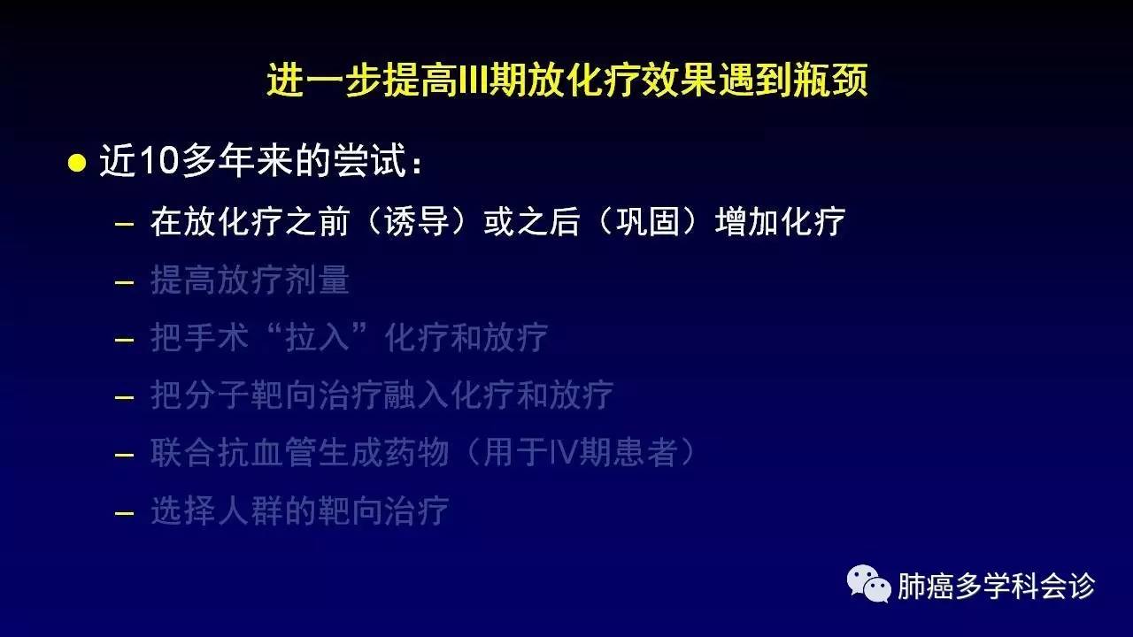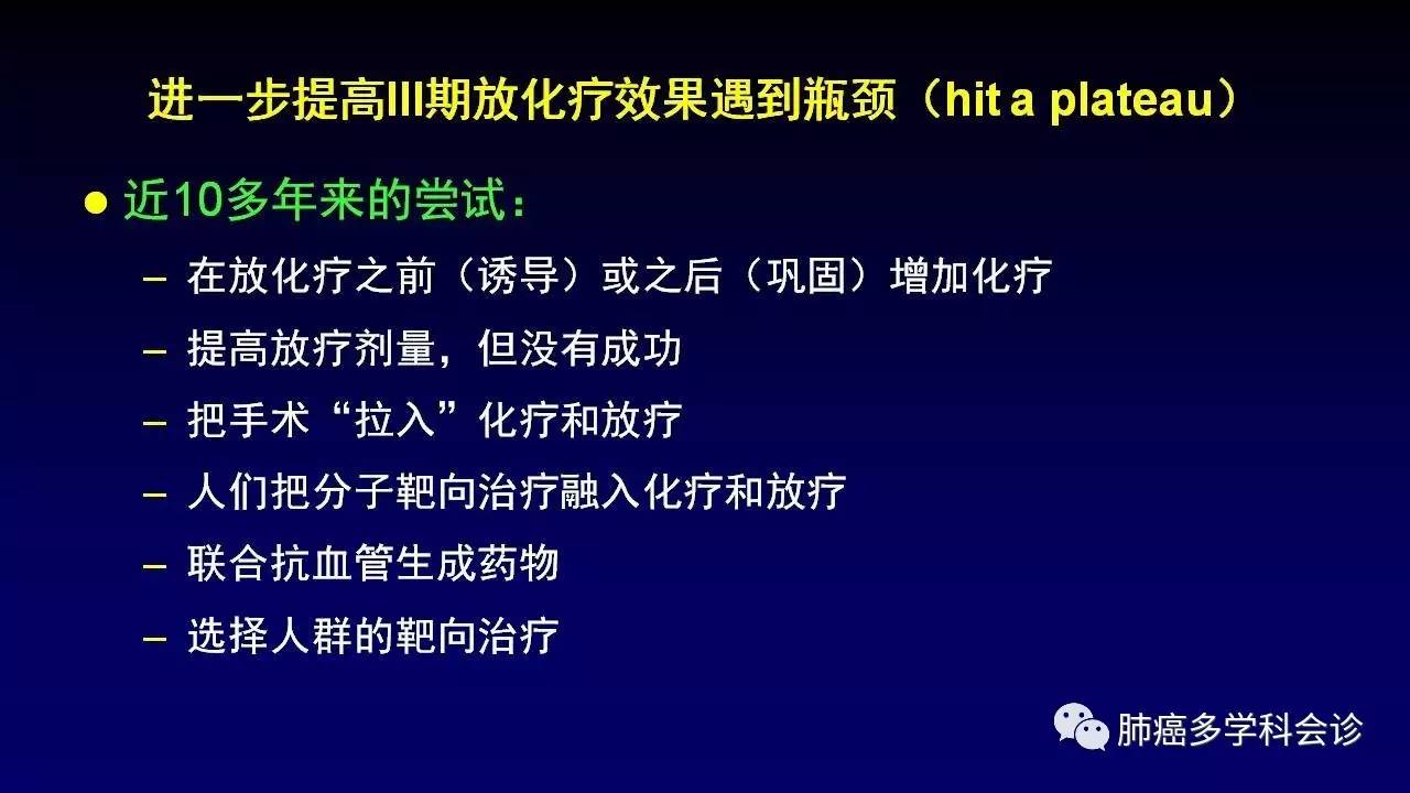 进一步提高III期放化疗效果遇到瓶颈(hit a plateau),近10多年来的尝试: