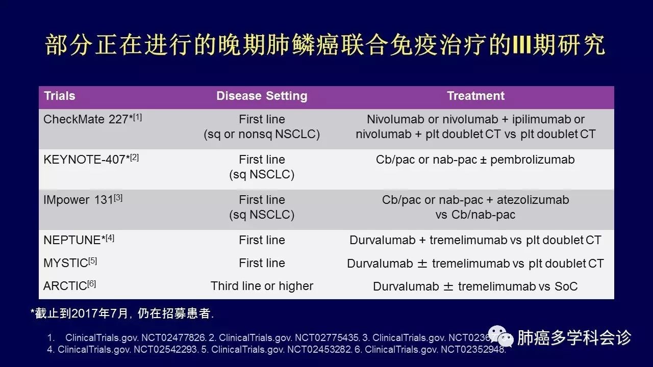 6. 进行中的III期联合治疗临床研究包括检查点阻断+化疗、双重检查点阻断。