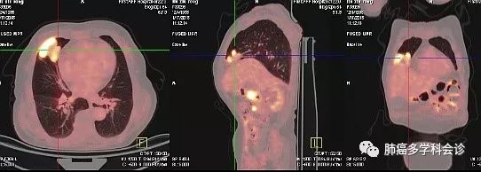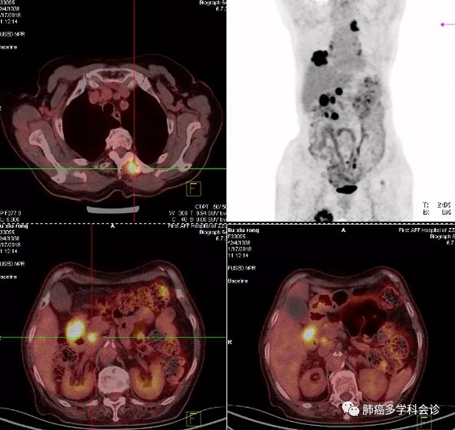 PET-CT示:1.十二指肠降部局部肠壁稍增厚代谢活跃,右肺中叶软组织肿块代谢活跃,考虑恶性病变;右侧顶叶及左侧顶枕叶多个稍高密度结节代谢活跃,腹腔多发肿大淋巴结代谢活跃,T4左侧附件骨质破坏伴软组织肿块代谢活跃,右侧大收肌内低密度团块影代谢活跃,考虑转移。2.右侧结肠旁沟内软组织结节代谢较活跃,考虑良性病变可能。3.右侧丘脑及双侧基底节区软化灶;双侧筛窦及上颌窦炎症。