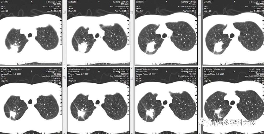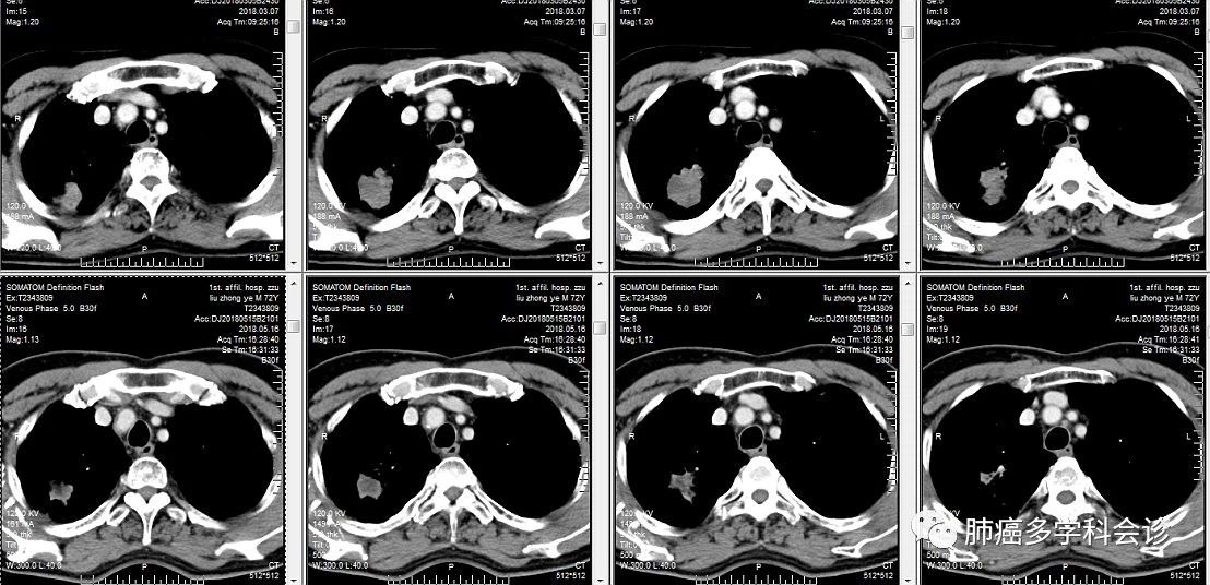 以下为患者在 PD-1抗体治疗前(上一行,2018-3-7)和治疗后(下一行,2018-5-16)胸部 CT 所显示的肿块大小,右上肺的肿块在肺窗(上图)和纵隔窗(下图)都明显退缩。