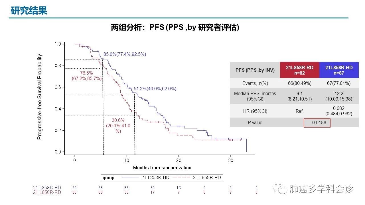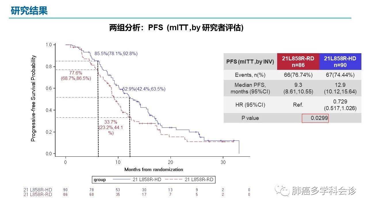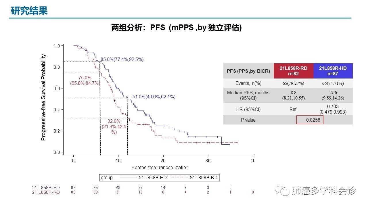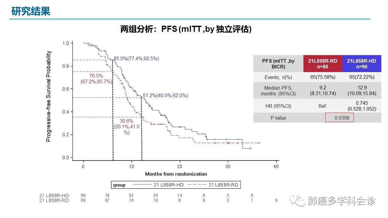 • 具有更长的mPFS:对于mITT人群, 21-RD与21 –HD相比,独立评估mPFS分别为9.2 月vs 12.9月,HR=0.75(95%CI : 0.53-1.05;p=0.0398;BICR,mITT);相比较于21-RD,21-HD组mPFS延长3.7个月