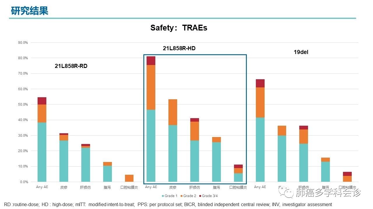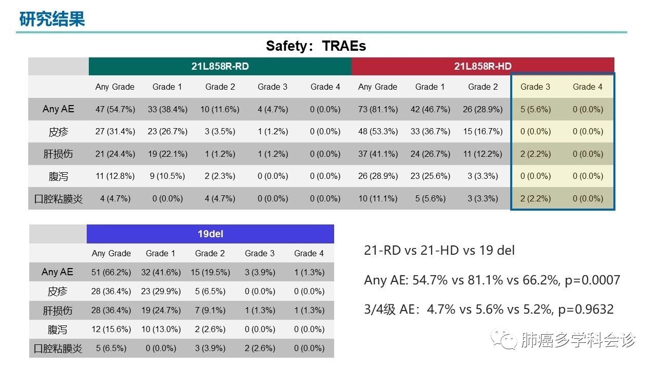 • 21 L858R-HD和21L858R-RD组总AEs具有统计学差异,主要是1/2级AE有所增加  (21 L858R-RD vs 21 L858R-HD vs 19 del: 54.7% vs 81.1% vs 66.2%,p=0.0007)