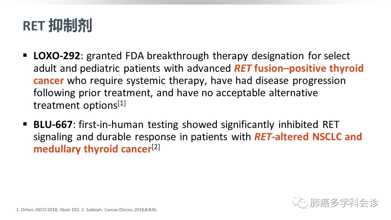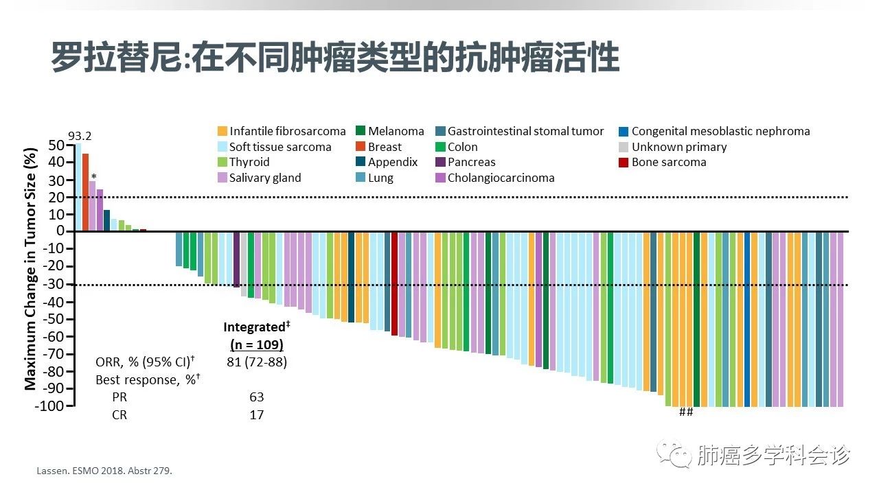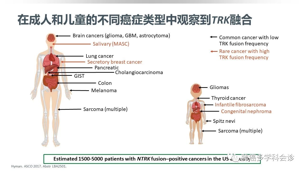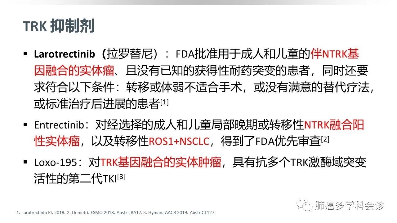 拉罗替尼(Larotrectinib):FDA批准用于成人和儿童的伴NTRK基因融合的实体瘤、且没有已知的获得性耐药突变的患者,同时还要求符合以下条件:转移或体弱不适合手术,或没有满意的替代疗法,或标准治疗后进展的患者[1]
