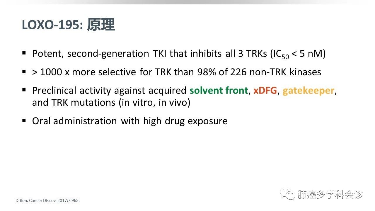 Loxo-195:对TRK基因融合的实体肿瘤,具有抗多个TRK激酶域突变活性的第二代TKI[3]