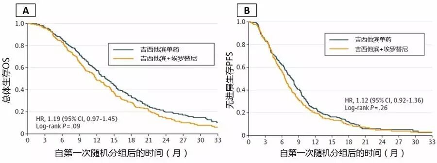 ◆自第一次随机化分组起,单药吉西他滨治疗组和吉西他滨+埃罗替尼治疗组的中位OS分别为13.6月和11.9月,差异无统计学意义。同样无进展生存期PFS也无明显差异。见下图K-M生存曲线。