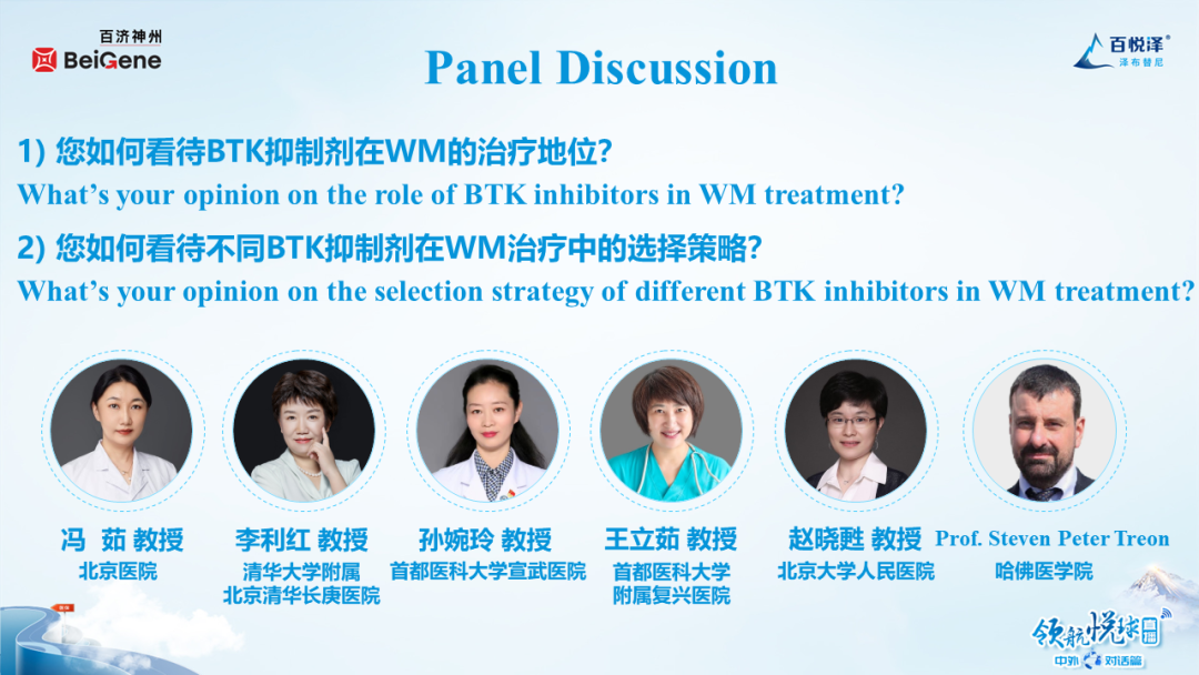 随后,在路瑾教授的主持下,来自北京医院的冯茹教授、清华大学附属北京清华长庚医院的李利红教授、首都医科大学宣武医院的孙婉玲教授、首都医科大学附属复兴医院的王立茹教授北京大学人民医院的赵晓甦教授和讲者Treon教授围绕BTKi在WM的治疗地位和不同BTKi在WM治疗中的选择策略等临床应用话题进行了热烈地讨论。专家们各抒己见,输出了很多专业见解。
