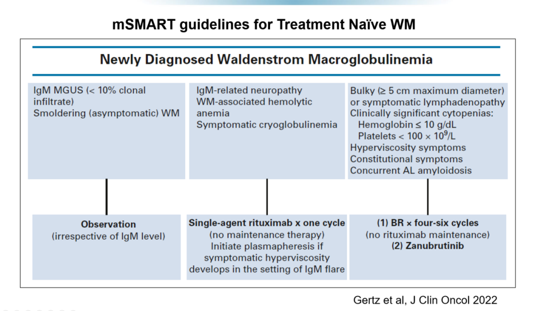 ◆ 来自梅奥诊所内科血液科顾问Morie A Gertz教授近期发表在JCO期刊关于WM治疗选择的综述中指出[4],基于泽布替尼在WM的循证医学证据,泽布替尼是梅奥指南唯一推荐用于治疗新诊断或复发/难治WM患者的BTKi。