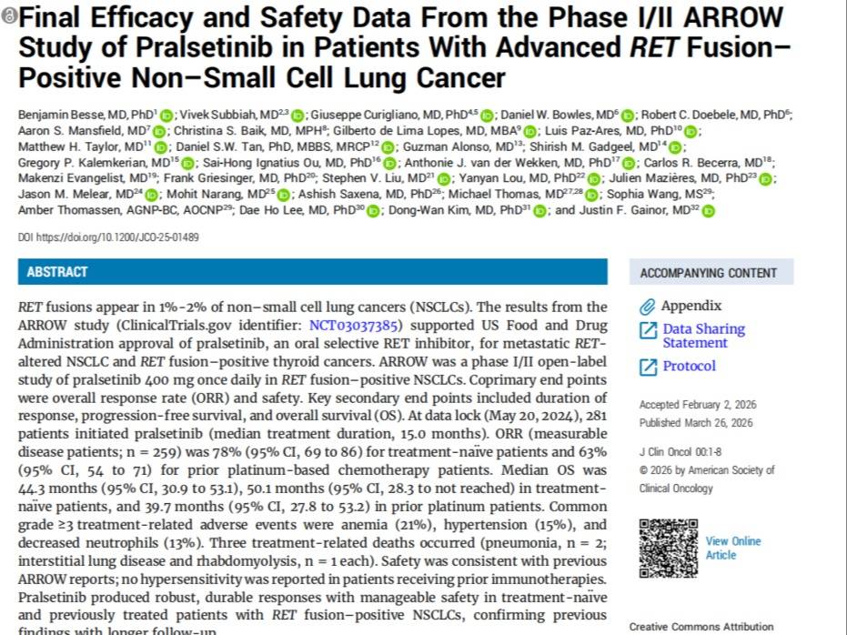 ARROW研究最终分析揭晓,普拉替尼一线治疗RET融合阳性NSCLC的OS可达50.1个月