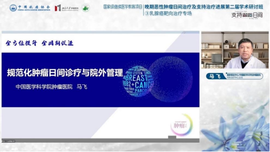 李青教授作为第一环节主持人引出了本场会议首位讲者:国家癌症中心/中国医学科学院肿瘤医院内科治疗中心主任马飞教授。马飞教授精彩讲解了《规范化肿瘤日间诊疗与院外管理》。