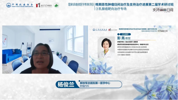 两场报告结束后,解放军总医院第一医学中心肿瘤内科杨俊兰教授作为第二环节讨论阶段的主持人介绍了参与本环节讨论的两位嘉宾。