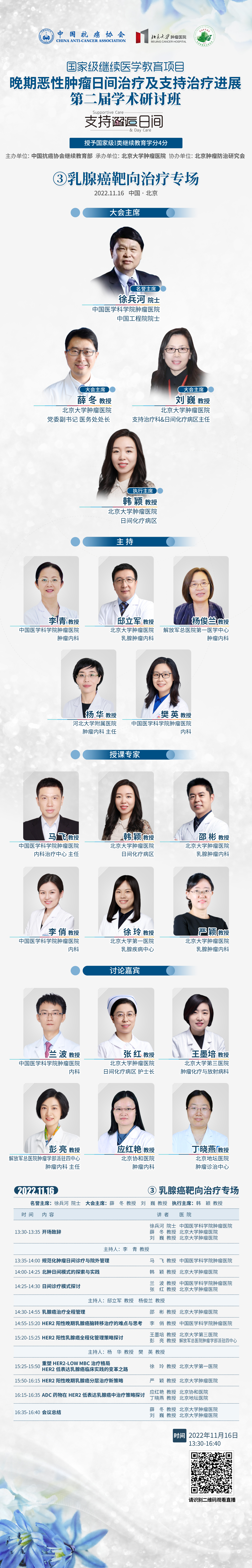 会议特别荣幸得邀请到中国工程院院士、肿瘤内科专家、北京协和医学院长聘教授、博士生导师徐兵河院士担任名誉主席,由北京大学肿瘤医院党委副书记、医务处处长、中西医结合暨老年肿瘤科副主任薛冬教授和北京大学肿瘤医院支持治疗科&日间化疗病区主任刘巍教授共同担任会议主席,由北京大学肿瘤医院日间化疗病区韩颖教授担任执行主席。本场会议云集了乳腺癌领域的诸多知名专家,邀请国家癌症中心/中国医学科学院肿瘤医院内科李青教授、樊英教授,北京大学肿瘤医院乳腺内科邸立军教授,解放军总医院第一医学中心肿瘤内科杨俊兰教授,河北大学附属医院肿瘤内科杨华教授担任环节主持。邀请国家癌症中心/中国医学科学院肿瘤医院内科治疗中心主任马飞教授、国家癌症中心/中国医学科学院肿瘤医院内科李俏教授、北京大学肿瘤医院日间化疗病区韩颖教授、北京大学肿瘤医院乳腺肿瘤内科邵彬教授和严颖教授以及北京大学第一医院乳腺疾病中心徐玲教授作为会议讲者,国家癌症中心/中国医学科学院肿瘤医院内科兰波教授、北京大学肿瘤医院日间化疗病区张红护士长、北京大学第三医院肿瘤化疗与放射病科王墨培教授、解放军总医院肿瘤学部派驻四中心肿瘤内科主任彭亮教授、北京协和医院肿瘤内科应红艳教授及首都医科大学附属北京地坛医院肿瘤诊治中心丁晓燕教授作为会议讨论嘉宾,就日间诊疗模式、乳腺癌治疗全程化管理、HER2阳性晚期乳腺癌脑转移治疗、乳腺癌HER2低表达治疗及HER2阳性乳腺癌分层治疗新策略等诸多热点问题进行了精彩的分享,课题领域丰富、内容详实、讲解深入浅出,引人入胜,让与会同道受益匪浅。