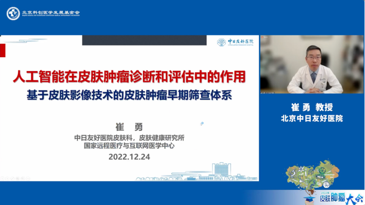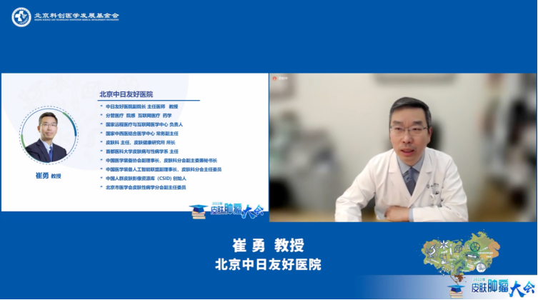 诊疗转化专场由中山大学附属肿瘤医院张晓实教授和北京大学肿瘤医院斯璐教授主持。来自北京中日友好医院崔勇教授从基层皮肤肿瘤的现状、皮肤影像诊断的拓展皮损可视化特征重要性强调了“人工智能在皮肤肿瘤诊断和评估中的作用”。就中国人群皮肤影像资源库(CSID)这一共性技术平台进行了详解,明确皮肤镜在皮肤肿瘤早期筛查中的重要性,尤其是对基底细胞癌的诊断率高达96.06%,结合临床相关病例研究提出应当进一步完善基于皮肤影像技术的皮肤肿瘤早期筛查体系,以为患者术前的正确诊断提供最佳治疗方案的选择及避免二次手术。