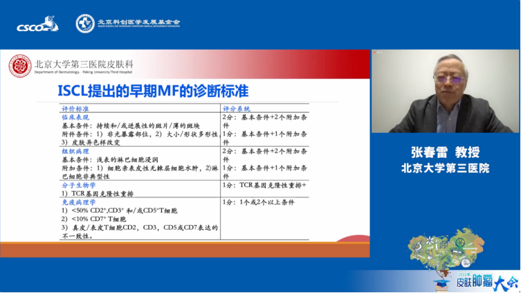 北京大学第三医院张春雷教授以“皮肤淋巴瘤的转化研究新进展”为题,结合临床病例介绍了国际皮肤淋巴瘤学会(ISCL)诊断MF/SS的评分法、MF/SS的TNMB 分期和预后、美国国立综合癌症网络(NCCN)临床实践指南;并对CTCL的转换临床研究,尤其是基于苦参+干扰素/西达本胺/青蒿的可行性治疗及鉴定和开发PAK1靶向治疗进行了提纲挈领的阐述,并对我国免疫学治疗新一代靶向药物的研发做出了展望。