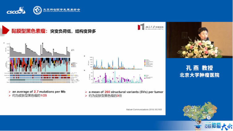 北京大学肿瘤医院孔燕教授 带来了“肢端和粘膜黑色素瘤微环境的特征与免疫应答的相关性”的分享。孔教授指出,中国肢端型黑色素瘤患者与西方队列相比,突变负荷、结构变异程度和拷贝数变异程度低,但肿瘤微环境特征复杂,IM患者显示出更多样化的细胞类型组成。但IM中部分细胞类型的丰度与免疫治疗结果相关。特异性分子标志物的鉴定是影响CAF细胞生物学研究和临床应用的关键问题,随着单细胞测序分析等生物技术的发展,精准靶向CAF信号通路的抑制剂联合PD-1单抗或将成为有效治疗手段。