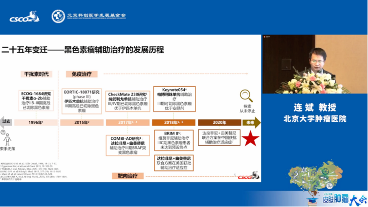 2022年12月24日,由中国临床肿瘤学会(CSCO)黑色素瘤专家委员会与北京科创医学发展基金会联合主办、北京大学肿瘤医院承办的“2022年皮肤肿瘤大会”成功举办。基于疫情防控的大背景下,本次会议采取了云端网络直播的模式。国内皮肤恶性肿瘤行业大咖隔空联动,内容涵盖基础前沿、诊疗转化、指南引领和实战演练4个章节,十余个课题,囊括了鳞状细胞癌、淋巴瘤、恶性黑色素瘤从基础到转化到临床多层面、多形式的内容,聚焦国际国内最新技术动态和学术前沿,并从多个维度解析皮肤恶性肿瘤最新指南中更新要点,系统性指导临床实践。【肿瘤资讯】特整理会议精粹,为各位读者带来一场开阔视野、引发思考、提升思路的学术盛宴。