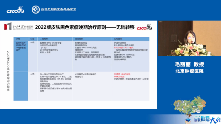 北京大学肿瘤医院 ,毛丽丽教授就CSCO黑色素瘤诊疗指南——针对晚期治疗进展进行精彩解读。对于晚期皮肤黑色素瘤,新版指南在III级推荐中增加了LAG3+PD-1的一线治疗推荐,以及携带NRAS突变患者应用MEK抑制剂的二线治疗推荐。NRAS突变一直被认为是黑色素瘤重要的驱动基因,但临床缺乏有效的治疗药物。目前主要的研究方向是针对RAS下游的MEK蛋白,多种MEK抑制剂在相关领域进行探索。国内针对NRAS突变晚期黑色素瘤的MEK抑制剂药物HL-085正在进行中。对于晚期肢端黑色素瘤,新版指南在III级推荐中增加了卡瑞利珠单抗+阿帕替尼+替莫唑胺的一线治疗推荐。对于晚期粘膜黑色素瘤,此次CSCO指南并无更新。晚期粘膜黑色素瘤的治疗一线仍以化疗为主。