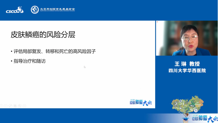 本专题最后,由来自四川大学华西医院王琳教授为大家带来了2022 CSCO皮肤鳞癌诊疗指南相关解读。王教授指出皮肤鳞状细胞癌发病率快速增长,病理相关的危险因素如组织学类型、病变深度、血管或淋巴受累应当是临床医生需着重关注的。对于没有临床区域淋巴结转移证据的局灶性 皮肤鳞状细胞癌,最常见的治疗方式是手术。尽管手术治疗通常为最有效的治愈手段,但出于对功能、美观以及个人意愿等因素,患者可能会选择放疗作为初始治疗。最后,王教授对靶向药物在治疗转移性皮肤鳞状细胞癌的临床研究进行了简要总结报告及展望。