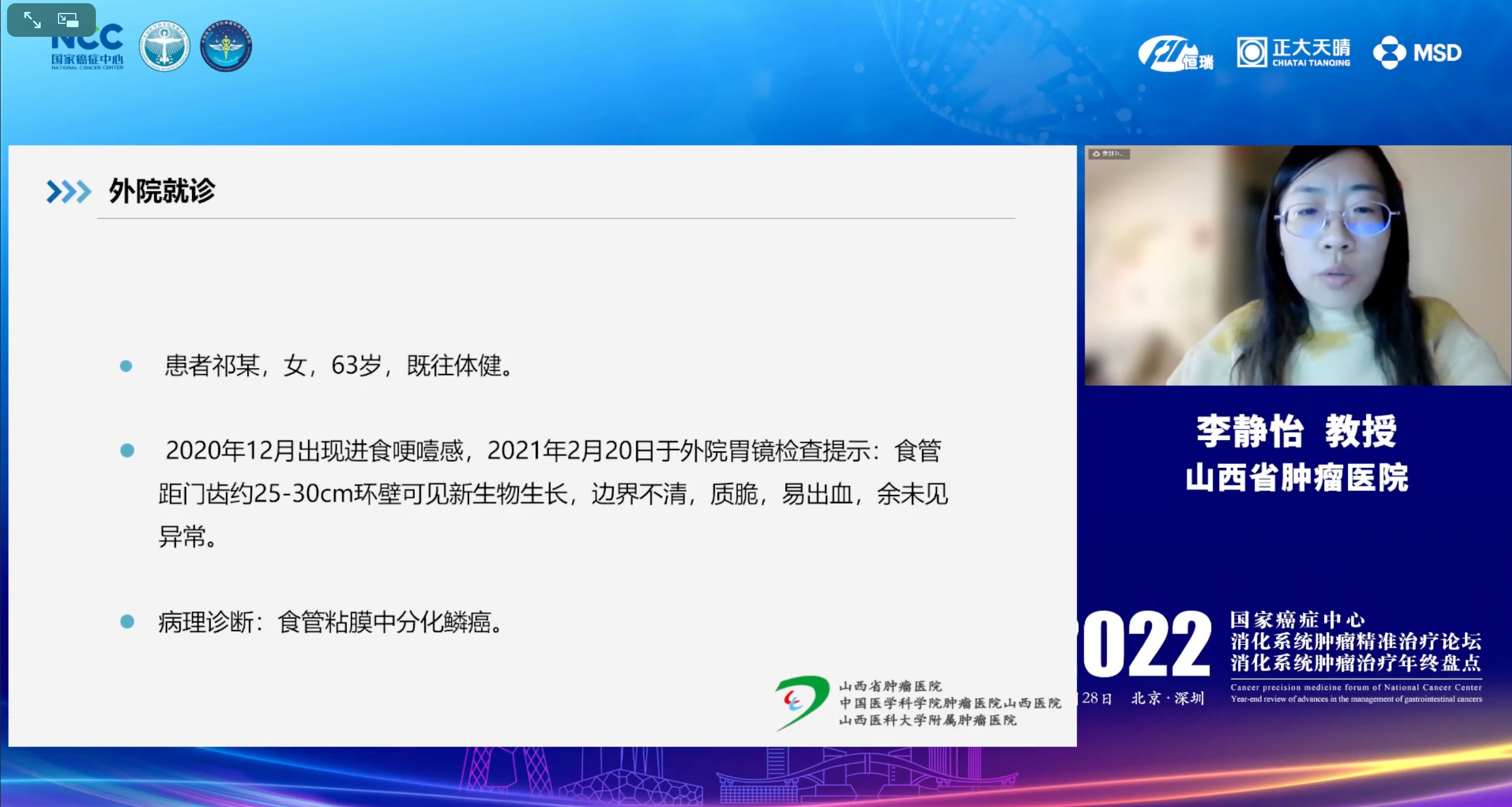 在山西省肿瘤医院杨牡丹教授主持下,山西省肿瘤医院李静怡医师带来一例“食管黏膜中分化鳞癌”病例分享,并提问“患者达到cCR后,治疗多久停药?”“cCR的患者是否还需要手术或放射治疗?”。随后,山西省肿瘤医院MDT团队中胸外科张宏广教授认为病例中是否能从手术进一步获益,从临床角度尚无定论。既往研究提示pCR或cCR并不一定能转化成OS获益,因此需要更多数据探索。放疗科杜文静教授表示对于晚期食管癌,局部放射治疗可用于:内科治疗患者仍有吞咽困难或者局部溃疡,提高生存质量或进一步提高内科治疗机会;经内科治疗后虽无临床症状但影像学提示肿瘤残留。在本例病例中因其具免疫优势可建议暂不放疗,但需密切随访。特需医疗部刘晓玲教授表示该患者病灶控制良好,建议密切随访,停药前需评估。
