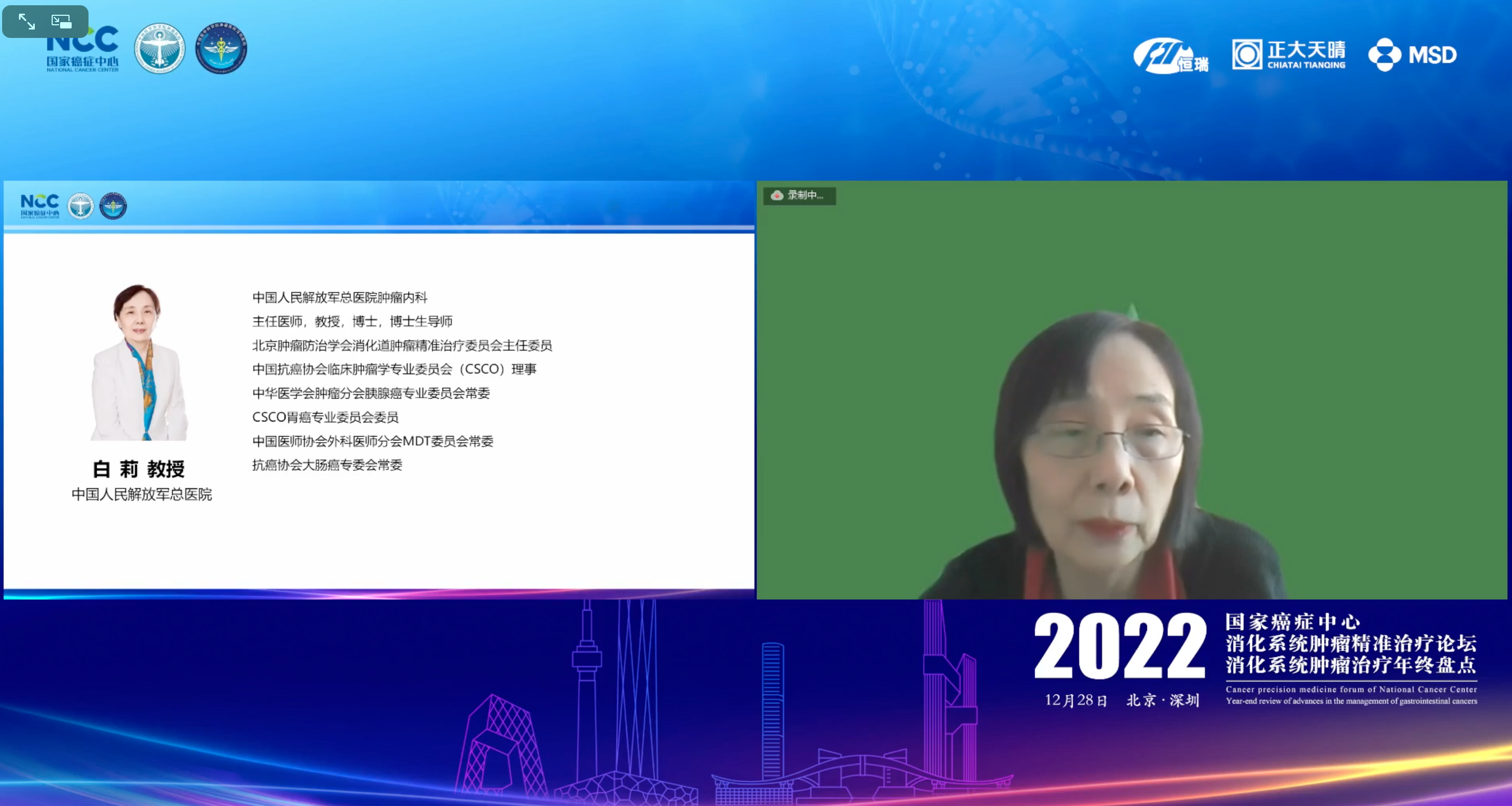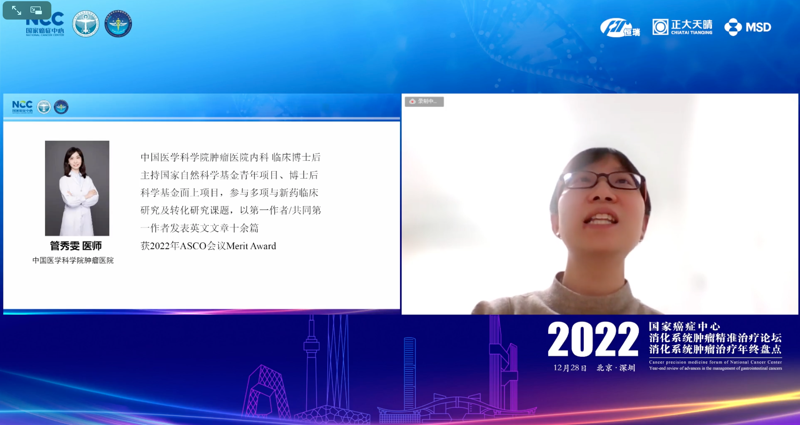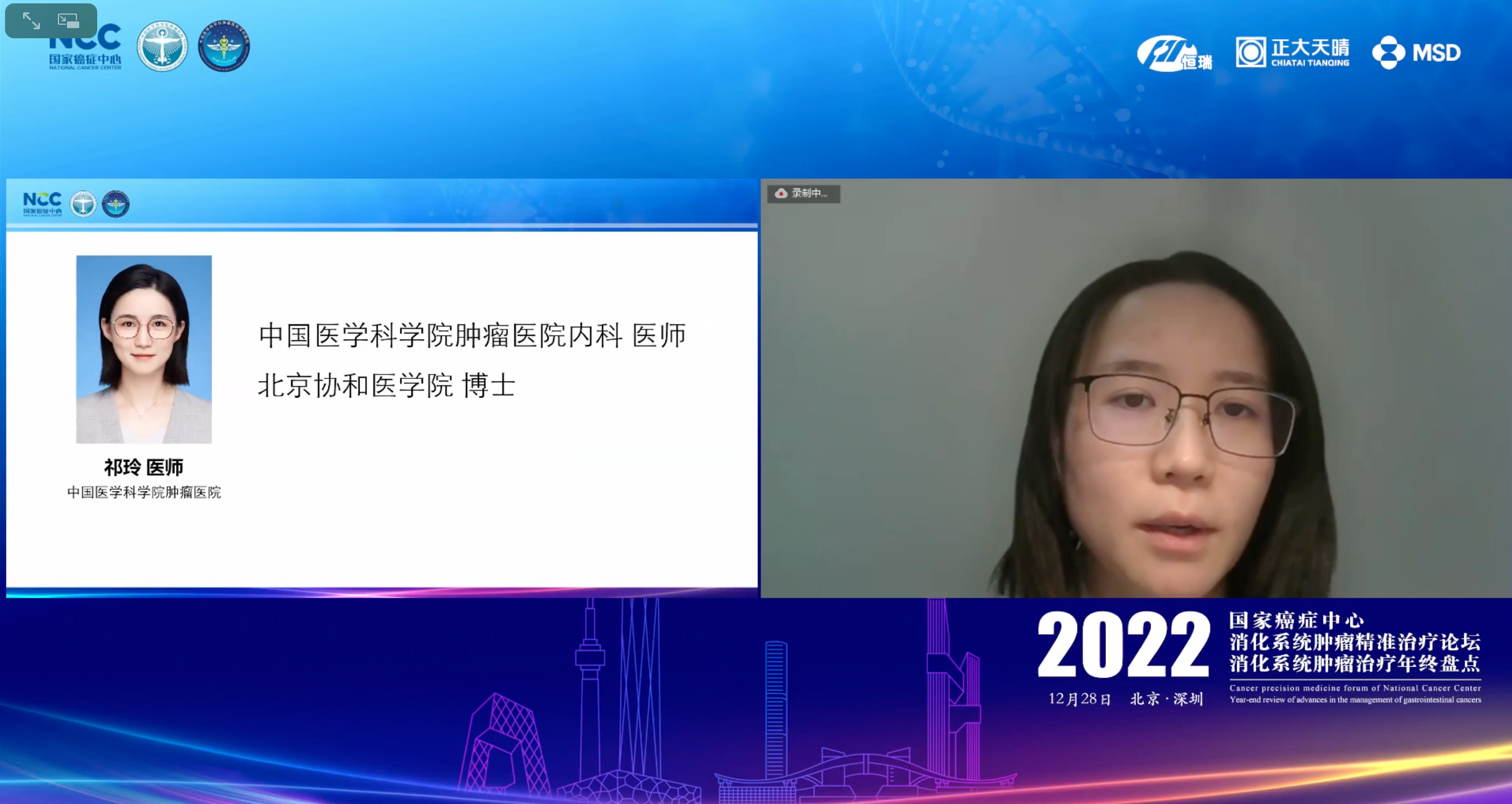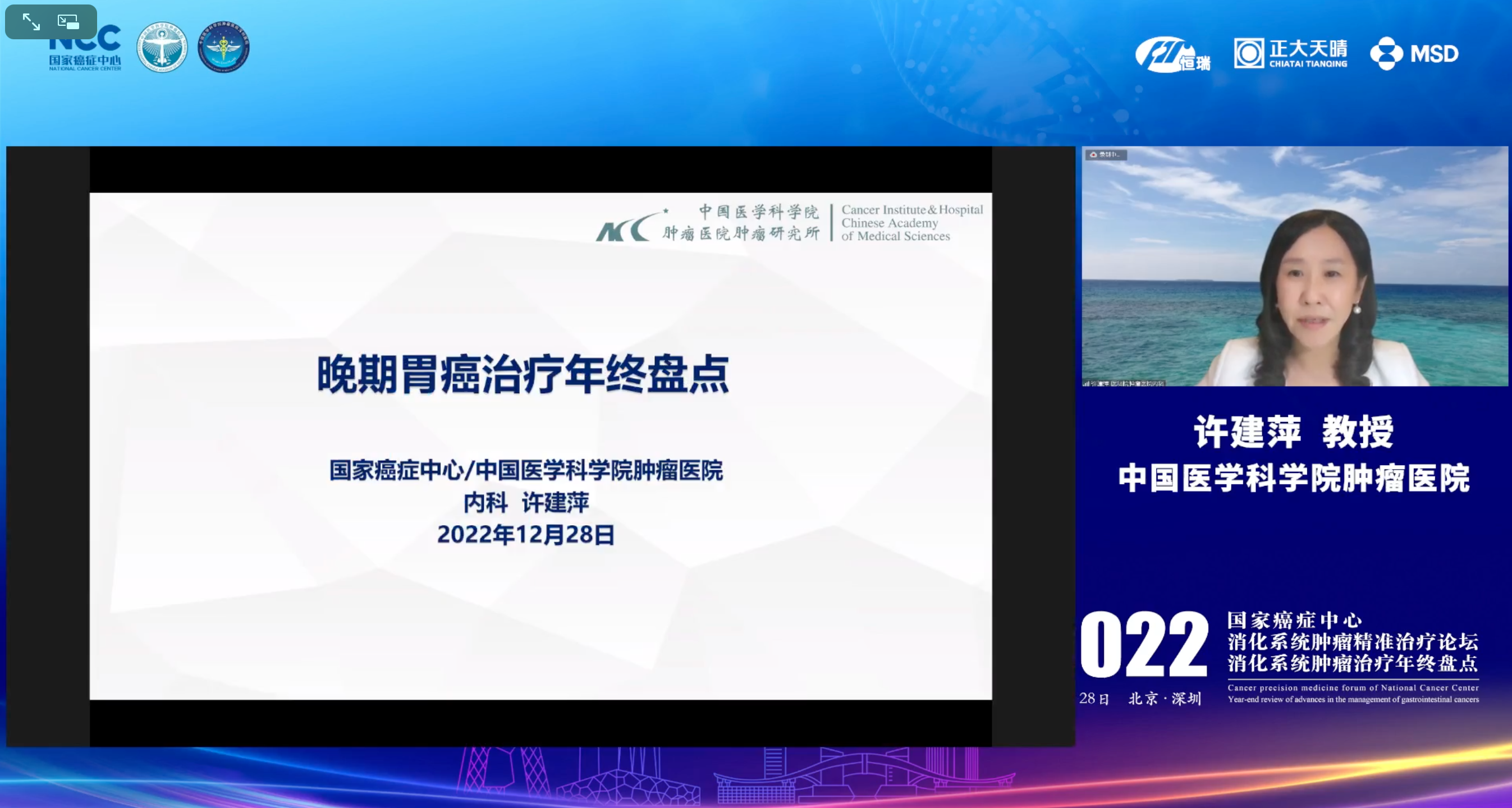 在同济大学附属东方医院李进教授主持下,中国医学科学院肿瘤医院许建萍教授带来题为“2022年晚期胃癌治疗年终盘点”分享。许教授从胃癌诊疗现状、晚期胃癌免疫治疗进展以及靶向治疗进展进行阐述,并介绍本院目前取得的瞩目成果。中国胃癌患者基数大、分期晚、生存差且三线治疗率低。免疫治疗疗效显著,安全性良好,已经改写晚期转移性胃癌治疗格局,且随着免疫治疗的不断探索,为胃癌围术期治疗带来新的选择。此外,靶向治疗以及新靶点的探索也是目前探索重要方向。总之,内科治疗从后线不断向前线推进,不断突破着既往的治疗瓶颈,期待现有研究的更多数据公布。