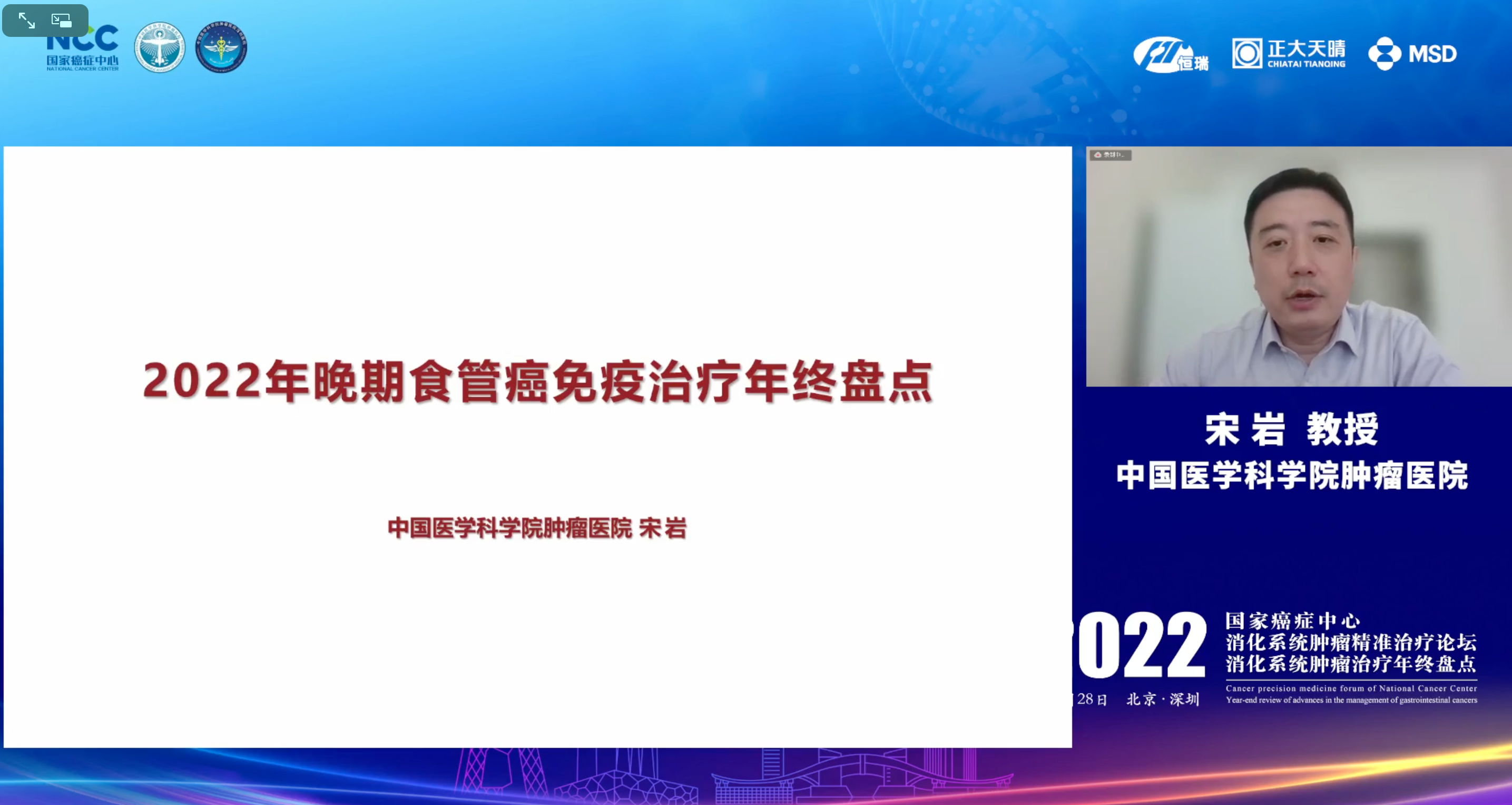 在中国人民解放军总医院白莉教授主持下,中国医学科学院肿瘤医院宋岩教授带来 “2022年晚期食管癌免疫治疗年终盘点”。宋教授表示食管癌既往缺乏有效改善患者生存药物,本次分享对食管癌相关研究新进展进行梳理后指出,进入免疫时代后化疗联合PD-1单抗已经成为食管癌晚期一线标准治疗。目前研究热点有PD-1联合靶向、PD-1联合如TIGIT,CTLA-4的新靶点、免疫治疗跨线应用等,其中化疗联合PD-1+靶向或双免疫联合探索值得期待。此外,筛选优势人群是进一步提高疗效的关键。