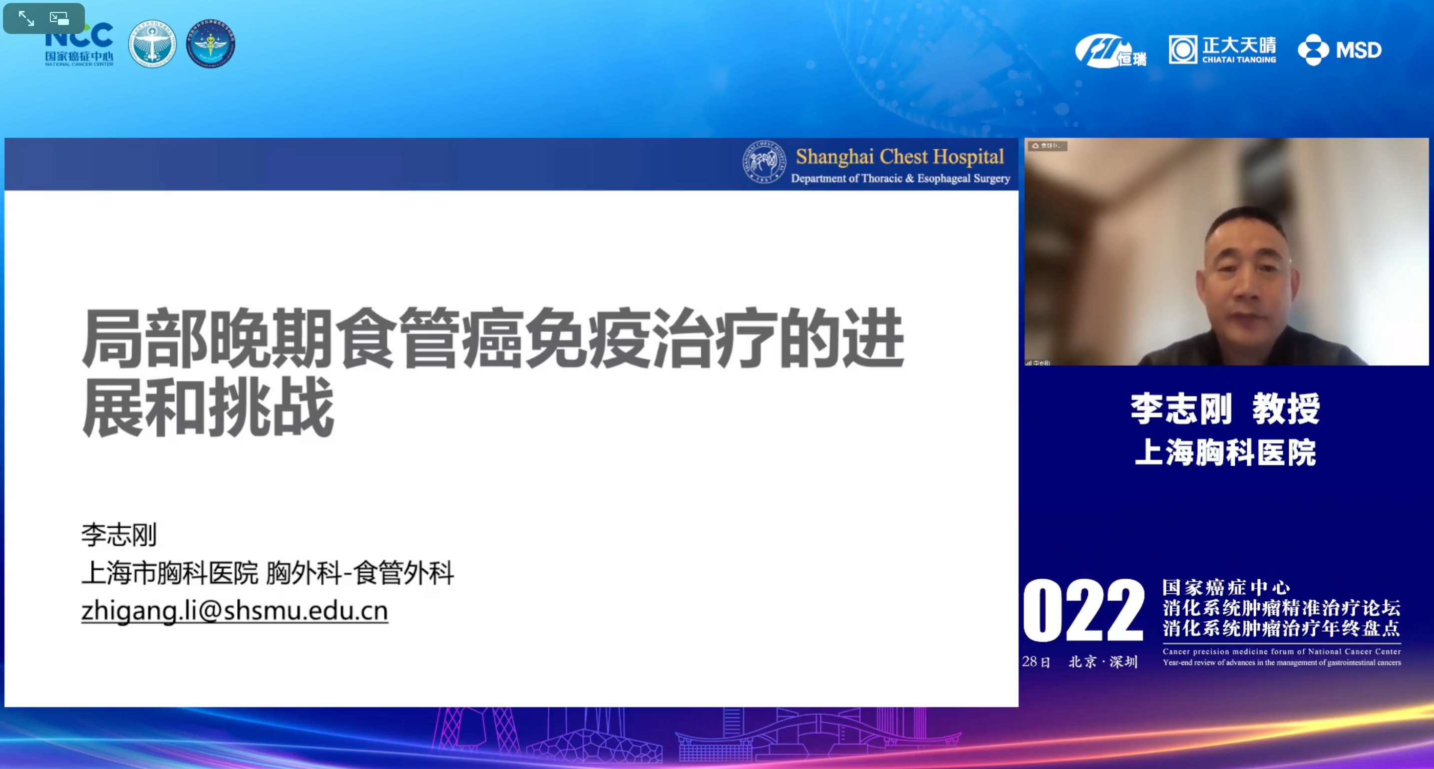 上海胸科医院李志刚教授带来题为“局部晚期食管癌免疫治疗进展和挑战”的分享,主要从局晚期食管癌发病情况、免疫与新辅助、疗效评估与挽救性免疫治疗的顺序的安排、转化治疗中的免疫治疗角色以及术后辅助免疫治疗多个维度进行讲解。李教授表示,未来可通过更高的综合治疗比例,尤其是术前辅助治疗、更彻底的根治术、更有效的术后辅助治疗方案提升食管癌治疗效果。目前,NICE、NICE-2等研究在不断验证免疫治疗在新辅助治疗中作用。同时疗效评价十分重要,其帮助优化治疗序列以期获得最佳治疗效果。在术后辅助治疗中,免疫治疗长期使用不良反应值得警惕,并期待更多的中国数据以克服这一应用困境。