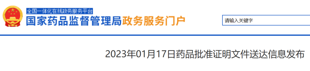 [1]2023年01月17日药品批准证明文件送达信息发布 . Retrieved Jan 17 , 2023. From https://www.nmpa.gov.cn/zwfw/sdxx/sdxxyp/yppjfb/20230117144508144.html