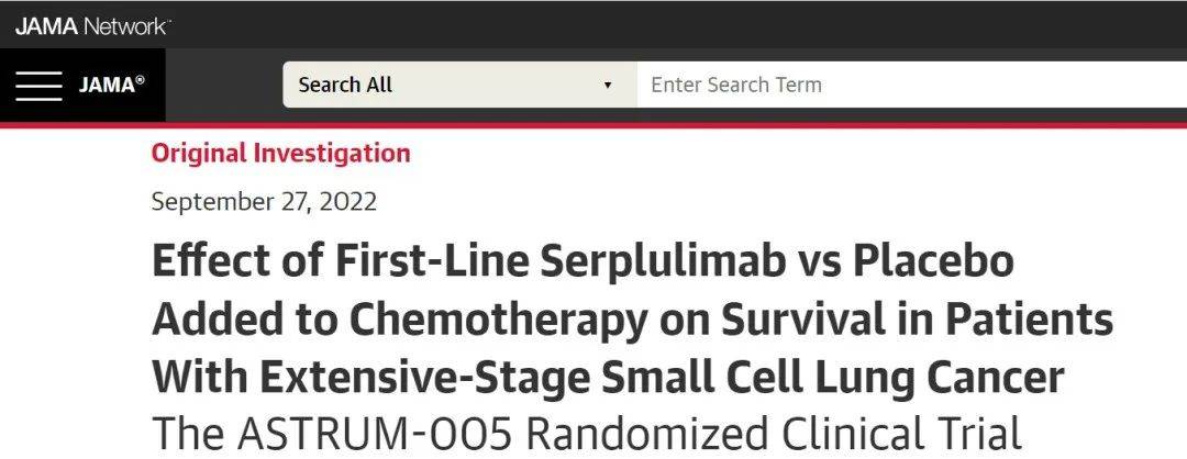 公开资料显示,此次斯鲁利单抗在中国获批的新适应症为一线治疗广泛期小细胞肺癌。该新适应症上市申请主要基于一项代号为ASTRUM-005的随机、双盲、国际多中心3期临床研究结果。该研究由吉林省肿瘤医院颖教授牵头,主要目的是在既往未接受过治疗的ES-SCLC患者中,比较斯鲁利单抗联合化疗的临床有效性和安全性。此前,这项研究成果已在2022年美国临床肿瘤学会(ASCO)年会上以口头报告形式展示,并且在《美国医学会杂志》(JAMA)在线发表
