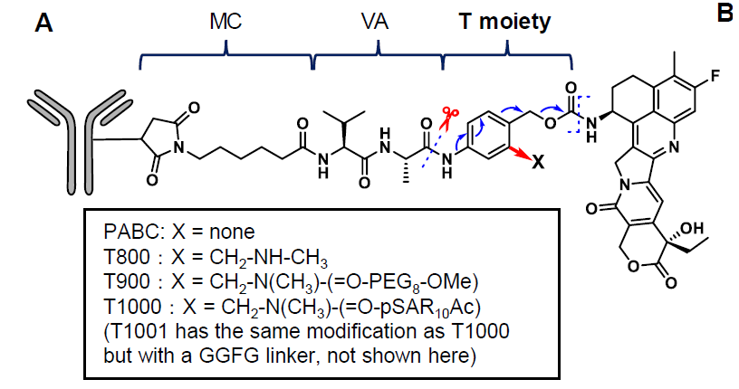 在这篇论文中,研究团队对exatecan和DXd/SN-38作为ADC载荷进行了系统性的比较,开发出一种名为“T moiety”的创新化学,在掩盖exatecan的疏水性同时,允许使用临床验证的连接子将它偶联在单克隆抗体上