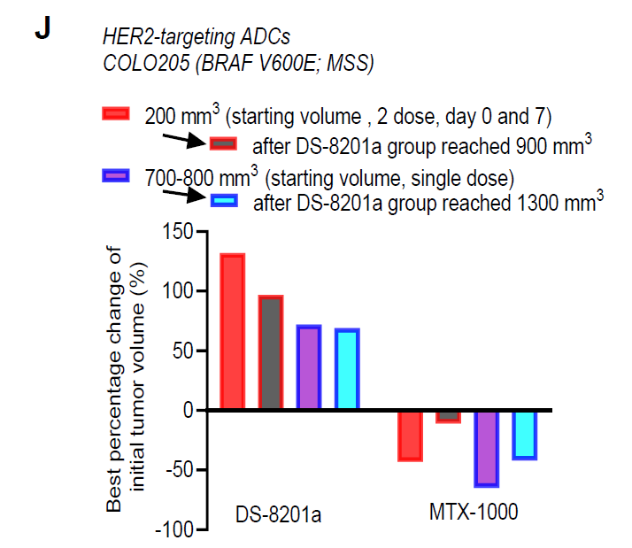 实验结果显示,利用这一技术将exatecan偶联在抗体上产生的ADC(MTX-1000),与基于DXd/SN-38的ADC相比,获得更好的治疗指数,并且肿瘤内药效学特征得到改善。这些改善导致MTX-1000在治疗靶点蛋白表达水平低,肿瘤体积大,或者对DXd/SN-38为载荷的ADC产生耐药性的肿瘤时,表现出更好的抗肿瘤效力