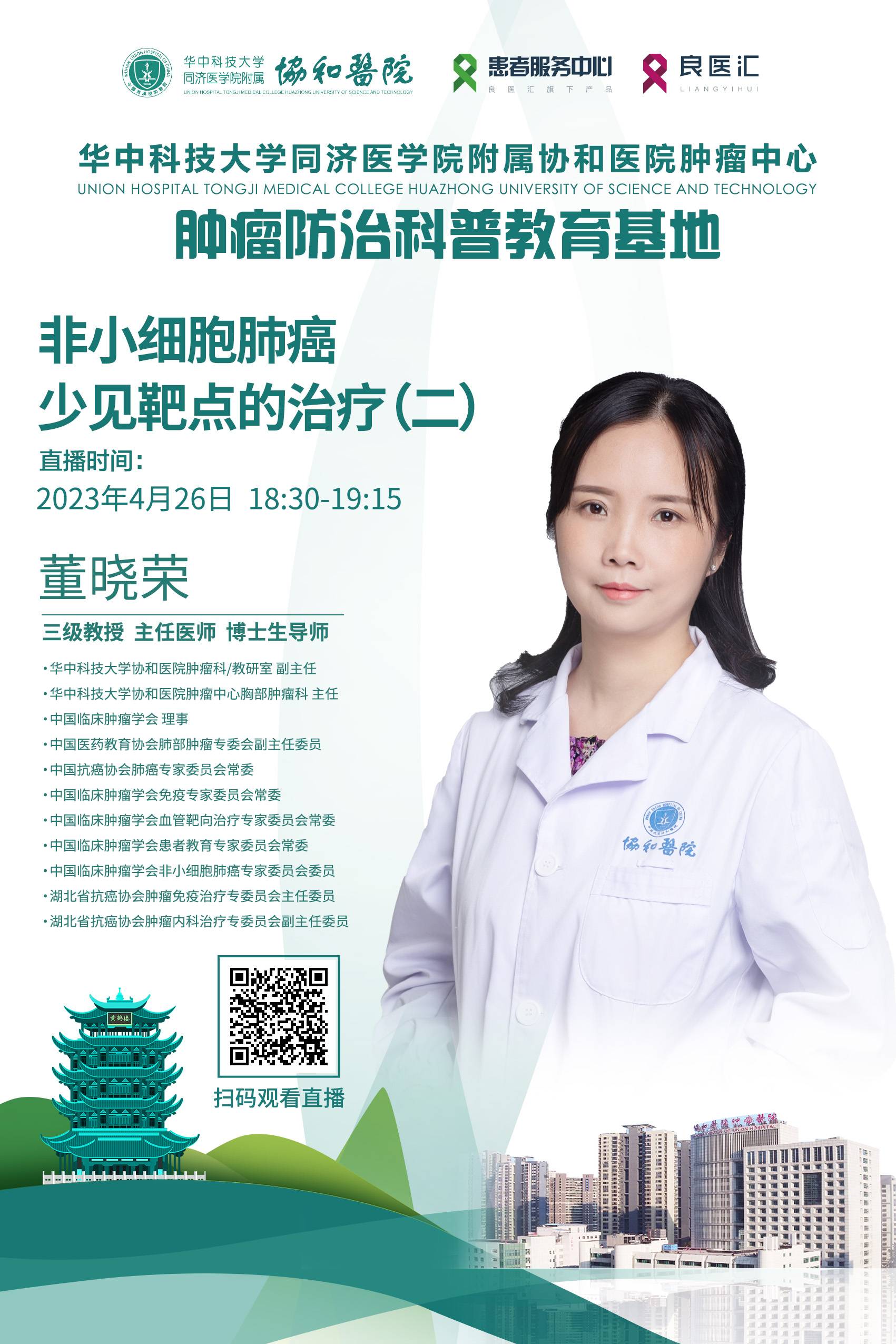 在全球范围内,肿瘤的发病率、死亡率都呈上升趋势。恶性肿瘤已成为危害人类健康的重要杀手。为了更好地让大家认识肿瘤疾病本身,让肿瘤患者获得更加规范的指导。 华中科技大学同济医学院附属协和医院联合良医汇患者服务中心举办大型在线科普义诊活动。2023年4月26日,董晓荣教授为大家带来《非小细胞肺癌少见靶点的治疗(二)》的科普直播讲课,欢迎大家扫码观看。