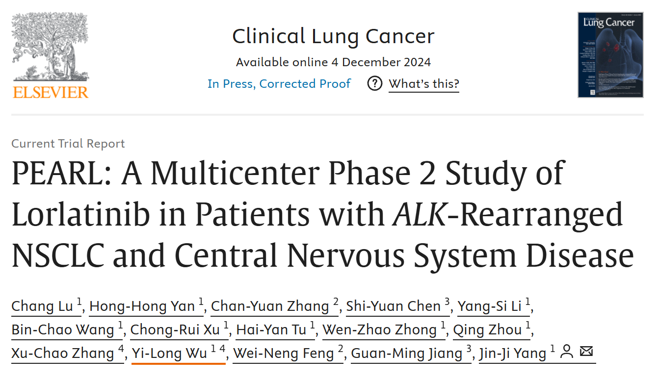 Lu C, Yan HH, Zhang CY, Chen SY, Li YS, Wang BC, Xu CR, Tu HY, Zhong WZ, Zhou Q, Zhang XC, Wu YL, Feng WN, Jiang GM, Yang JJ. PEARL: A Multicenter Phase 2 Study of Lorlatinib in Patients with ALK-Rearranged NSCLC and Central Nervous System Disease. Clin Lung Cancer. 2024 Dec 4:S1525-7304(24)00265-1. doi: 10.1016/j.cllc.2024.12.002. Epub ahead of print. PMID: 39721825.