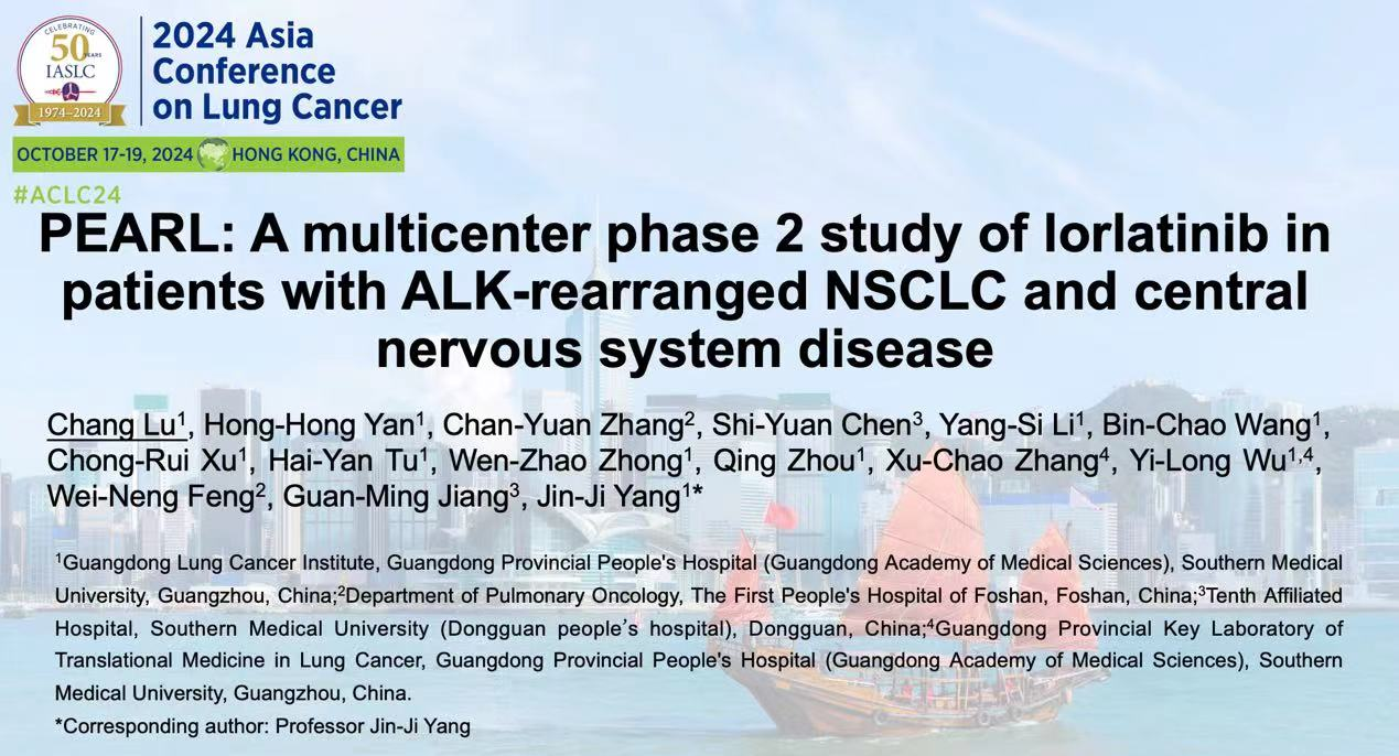 中枢神经系统(Central nervous system, CNS)转移,包括脑实质和脑膜转移,是非小细胞肺癌(NSCLC)患者长生存路上的“拦路虎”,会显著降低患者的生活质量并增加死亡率。如何帮助患者克服脑转移,进一步延长生存,是众多临床专家思考的难题。PEARL研究(CTONG2303/NCT06282874)是一项旨在改善ALK阳性NSCLC脑(膜)转移患者预后的多中心、前瞻性重要研究,不仅选择了具有强力颅内疗效的第三代ALK-TKI洛拉替尼,而且以患者为中心,采用了具有先进的CNS特异性标准评估真实世界疗效,并且尝试通过生物标志物深入探讨治疗反应及耐药机制。自公布以来,PEARL研究的进展备受瞩目,于2024年10月亚洲肺癌大会(ACLC)进行口头报告,并于2024年12月发表于Clinical Lung Cancer。