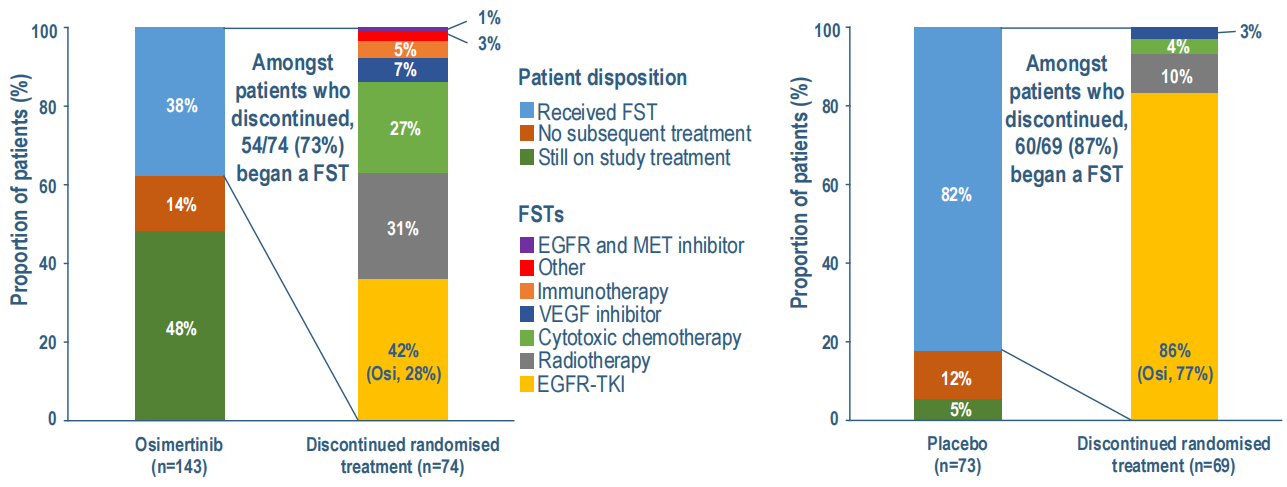 在奥希替尼组与安慰剂组中终止研究治疗并接受后续治疗的患者中,EGFR-TKI类药物是最常见的后续治疗方案,其次为含铂双药细胞毒化疗方案。结果表明,安慰剂治疗终止后的患者绝大多数接受了奥希替尼治疗,这对于解释最终OS数据非常重要。