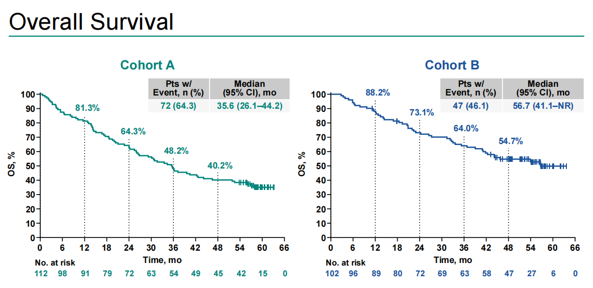 无进展生存期(PFS)结果显示,队列A的mPFS接近30个月,队列B的mPFS为45个月。