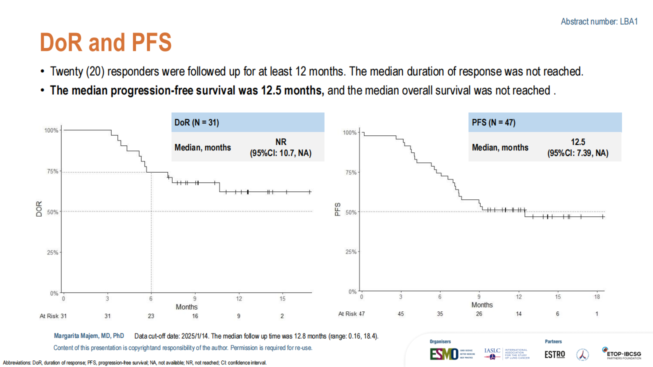 截至2025年1月14日,共纳入47例患者。患者的中位年龄为68岁,其中53.2%为男性,95.7%为白人。在吸烟状态方面,72.3%为既往吸烟者,23.4%为当前吸烟者。患者的ECOG PS评分为0-1,97.9%的患者为腺癌。TNM分期中,4.3%为IIIb期,53.2%为IVa期,42.6%为IVb期。34.0%的患者存在脑转移,23.4%存在骨转移,19.1%存在肾上腺转移。