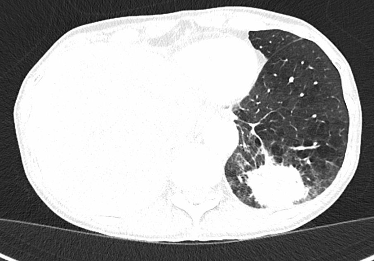患者为一名63岁的女性,吸烟史长达30包年,无其他显著病史。主诉为不明原因的皮疹,既往未接受过系统性治疗。胸部CT和PET检查显示可疑的代谢性肺部肿块,伴同侧纵隔淋巴结转移。为进一步明确诊断,患者接受了EBUS活检,病理结果显示为肺腺癌,病理分期为N2。基因检测未发现常见驱动基因突变(如EGFR、ALK等),而PD-L1 TPS高达90%。根据AJCC/UICC第8版TNM分期,该患者被诊断为IIIB期(cT3N2M0)肺腺癌。基于患者较高的PD-L1表达水平及分期特点,临床团队决定采用新辅助治疗策略,以期改善手术切除率和长期预后。患者接受2周期的卡铂、紫杉醇和纳武利尤单抗联合治疗。然而,在治疗过程中,患者出现严重的免疫相关不良事件,包括4级肝炎和肺炎,迫使治疗中断。为控制irAE,患者接受大剂量皮质类固醇(甲泼尼龙1mg/kg)联合霉酚酸酯的免疫抑制治疗,症状逐渐缓解。治疗中断后,患者接受中叶切除术,病理结果显示完全病理缓解(pCR),未发现存活的肿瘤细胞,仅见纤维炎性肿瘤退缩和坏死区域。这一结果表明,尽管治疗过程中出现严重的irAE,但新辅助免疫治疗仍取得了显著的抗肿瘤效果。