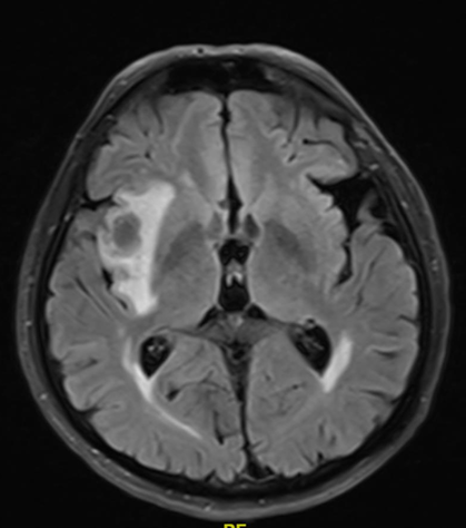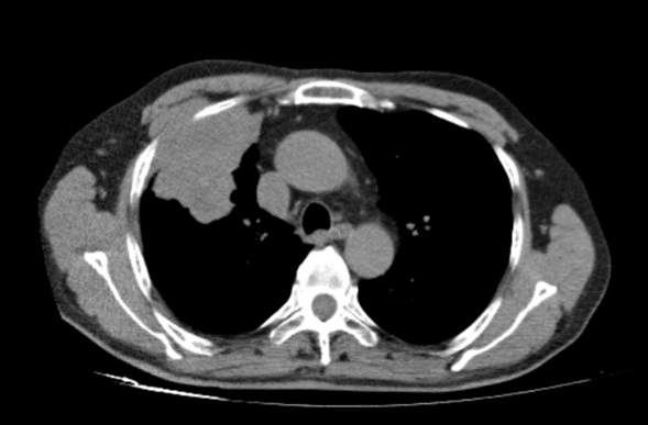 患者为69岁男性,吸烟史长达55包年,患有慢性阻塞性肺疾病(COPD),因背痛2月余入院。2021年12月,胸部CT和脑部MRI检查发现右侧上叶占位性病变,大小为68×66mm,并伴有右侧额颞部低密度病灶。2022年1月,PET-CT显示右侧上叶病灶增大至84×50mm,SUVmax为15.7,纵隔淋巴结(右侧气管旁、主动脉肺动脉、血管周围、气管旁)受累,SUVmax为3.15,右侧肾上腺转移灶大小为33×40mm,SUVmax为11.1。