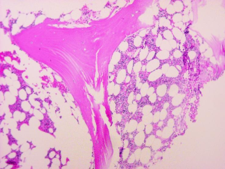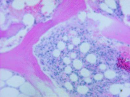 骨髓活检结果:造血细胞容积约60%,粒红比稍偏低,巨核细胞数量及形态正常,未见明确肿瘤。