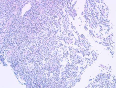 骨髓活检病理结果:骨髓-髂后见少量骨髓组织,结合免疫组化,考虑淋巴瘤累及骨髓。免疫组化结果:CD20 +,CD3 -,CD42b +,CD79a +,CD71 +,MPO +。