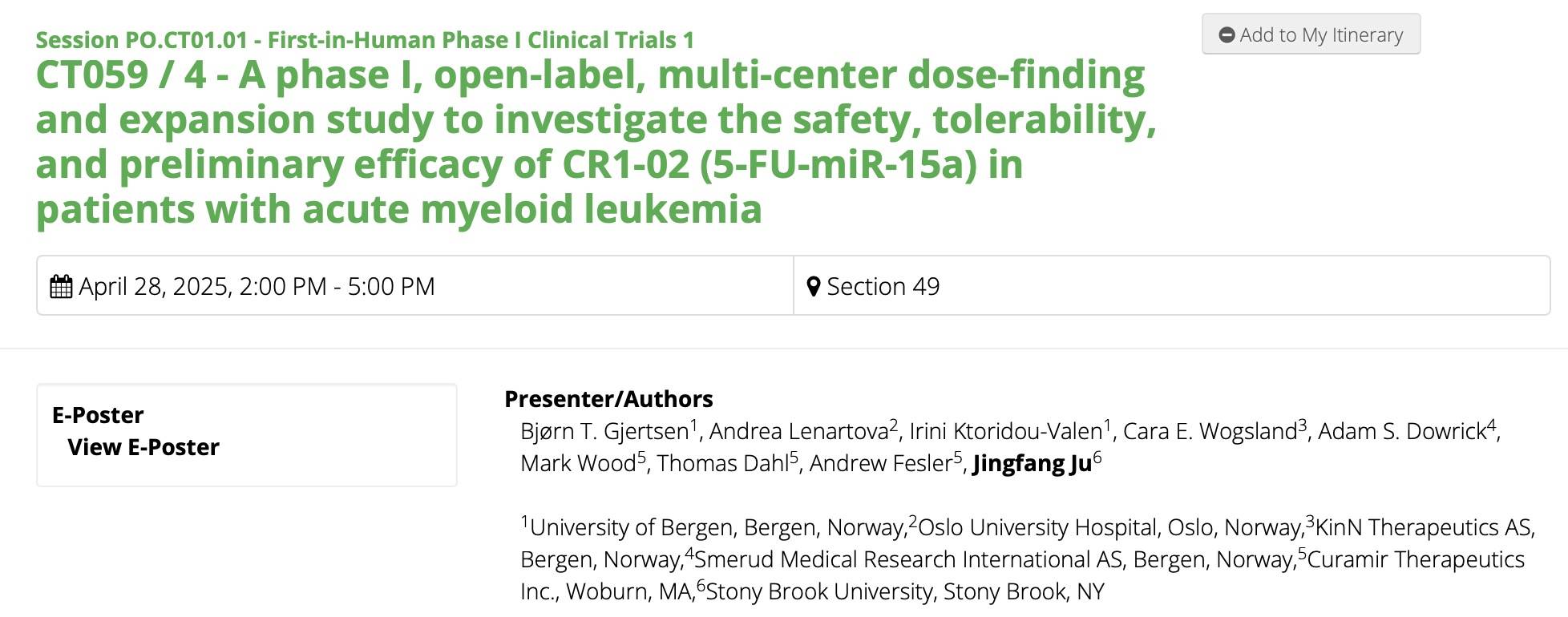 标题:A phase I, open-label, multi-center dose-finding and expansion study to investigate the safety, tolerability, and preliminary efficacy of CR1-02 (5-FU-miR-15a) in patients with acute myeloid leukemia