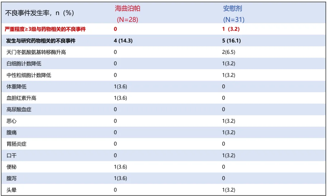 表1 海曲泊帕组和安慰剂组安全性评估