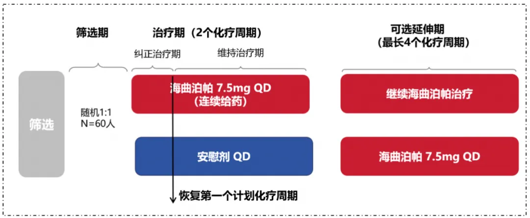 该研究2是一项随机、双盲、安慰剂对照、多中心研究,包括筛选期、治疗期(2个化疗周期)和可选延伸期(最长4个化疗周期)。研究纳入目前正在接受以21天为周期的化疗方案、因血小板减少导致化疗较预计的时间延迟≥1周,且血小板值<75×109/L,ECOG PS 0~1的恶性肿瘤患者。受试者按照1:1比例随机分配至海曲泊帕组(起始剂量7.5mg/d)或安慰剂组接受相应治疗,每天一次连续口服直至完成2个化疗周期,期间可根据血小板计数调整剂量或暂停给药;治疗期结束后,根据研究者判断,受试者可进入延伸期(图1)。研究的主要研究终点是治疗有效(在开始海曲泊帕治疗后14天内血小板≥100×109/L并恢复化疗,后续能够完成两个连续化疗周期,无因血小板减少导致的化疗方案调整且未使用任何升血小板援救治疗)的受试者比例