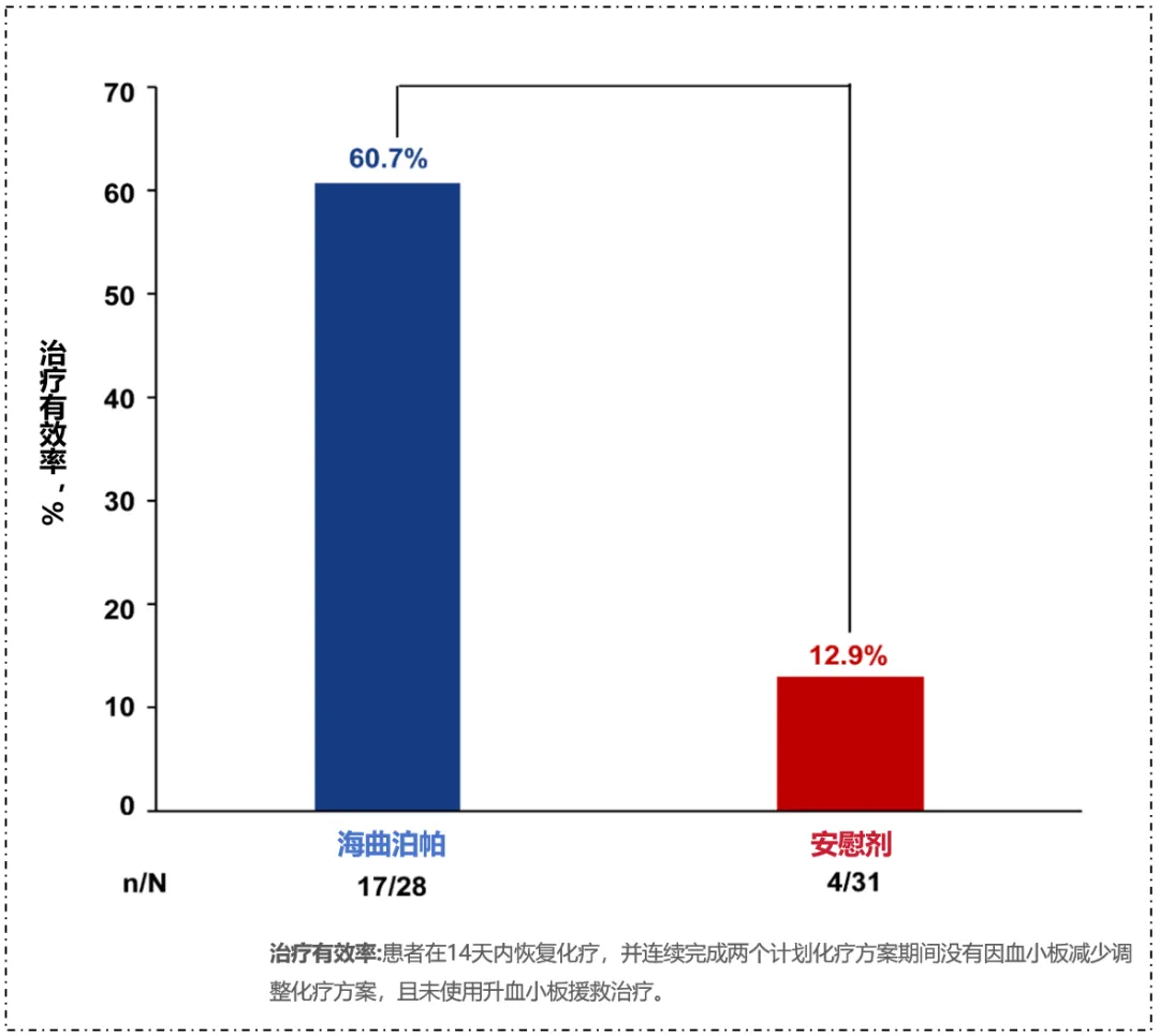 研究结果显示,海曲泊帕组达到主要研究终点,治疗有效率为60.7%,显著高于安慰剂组的12.9% (P=0.0001)。