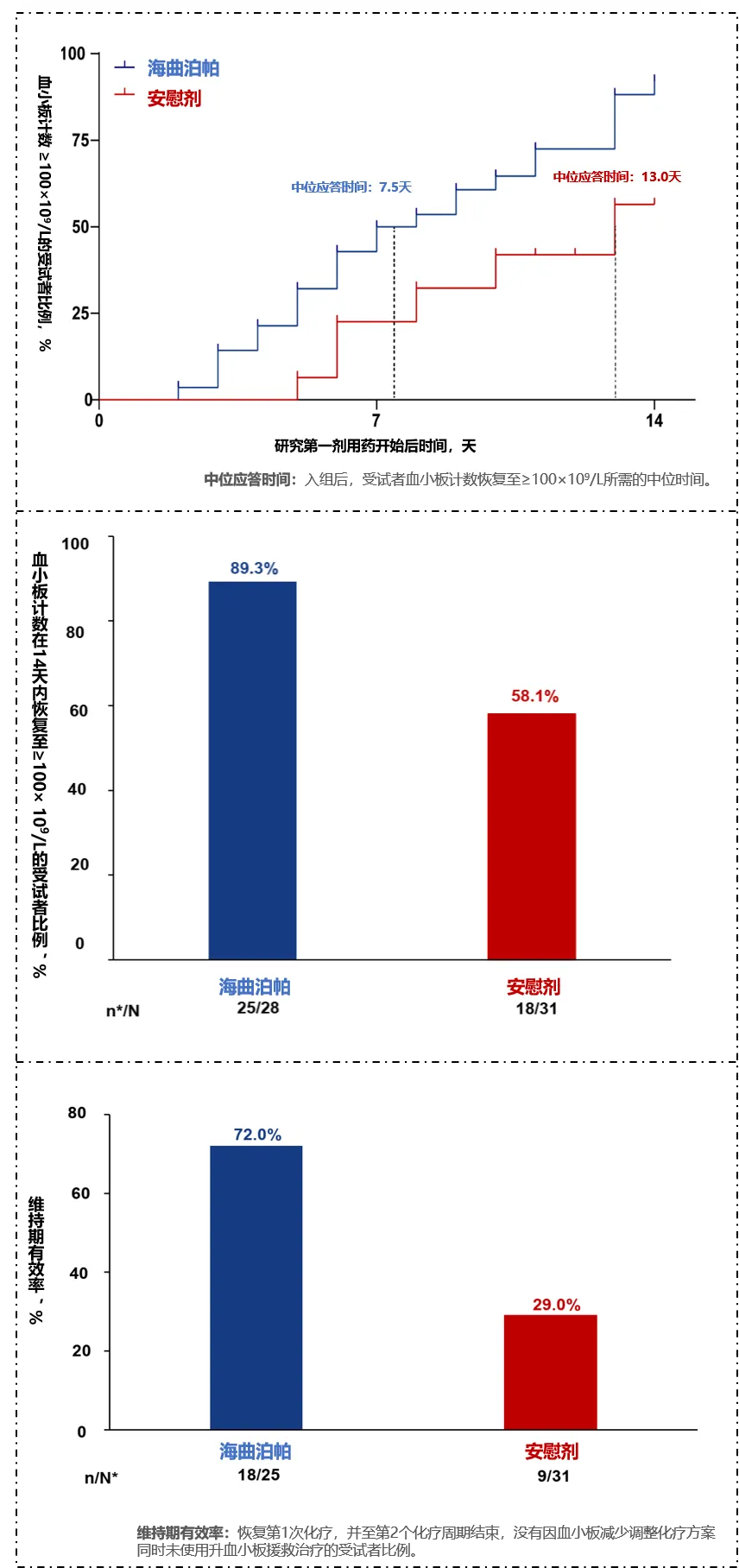 该研究2是评估海曲泊帕治疗CTIT疗效和安全性II期临床研究,凭借此项研究成果,海曲泊帕成为首个取得CTIT随机双盲多中心II期注册临床研究阳性结果的口服TPO-RA类药物。研究结果显示,7.5mg海曲泊帕连续给药可显著提高CTIT患者的治疗有效率,使CTIT患者更快恢复血小板水平,保证CTIT患者化疗及时开始且后续化疗周期按计划顺利进行,整体的给药安全性和耐受性良好。
