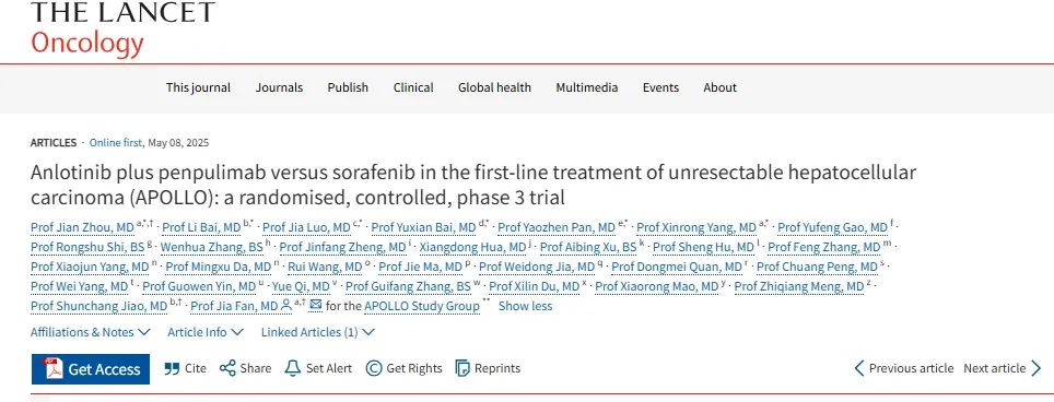 5月13日,正大天晴宣布,其1类创新药盐酸安罗替尼胶囊联合派安普利单抗注射液一线治疗晚期肝细胞癌(HCC)的关键注册3期临床试验(APOLLO研究)结果,在《柳叶刀》旗下肿瘤学期刊The Lancet Oncology(IF:41.6)上发表。