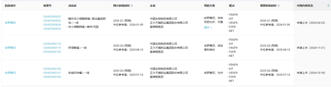 安罗替尼是正大天晴自主研发的一款口服新型小分子多靶点酪氨酸激酶抑制剂 (TKI) 。2018 年 5 月,该药首次获 NMPA 批准上市,成为中国首个获批用于 晚期非小细胞肺癌三线治疗 的药物。此后,该药又先后斩获 软组织肉瘤、 小细胞肺癌 (三线) 甲状腺髓样癌、甲状腺 分化 癌、小细胞肺癌 (一线 和子宫内膜癌 (二、三线 。本次是 安罗替尼获批的 第 8 个适应症
